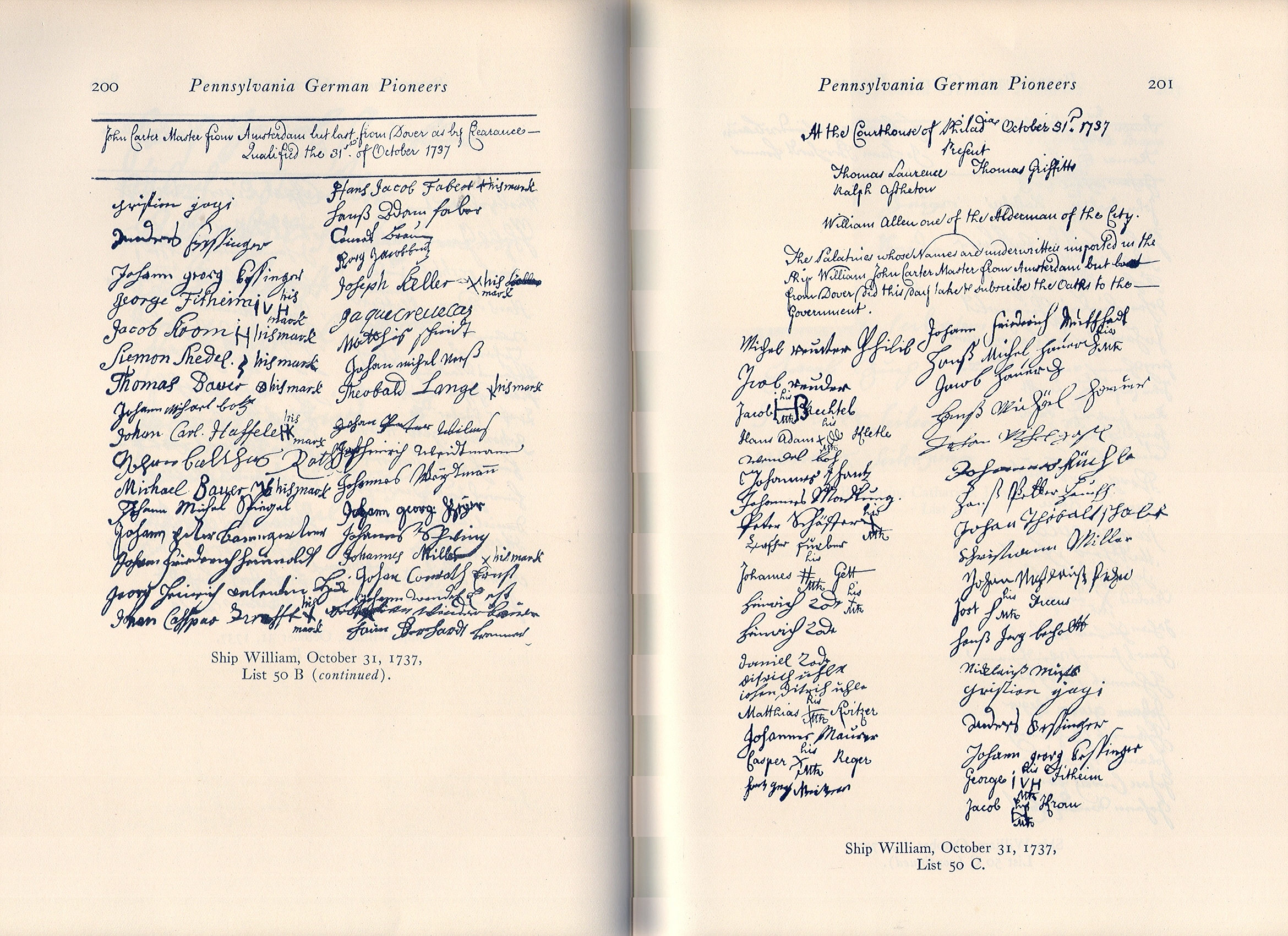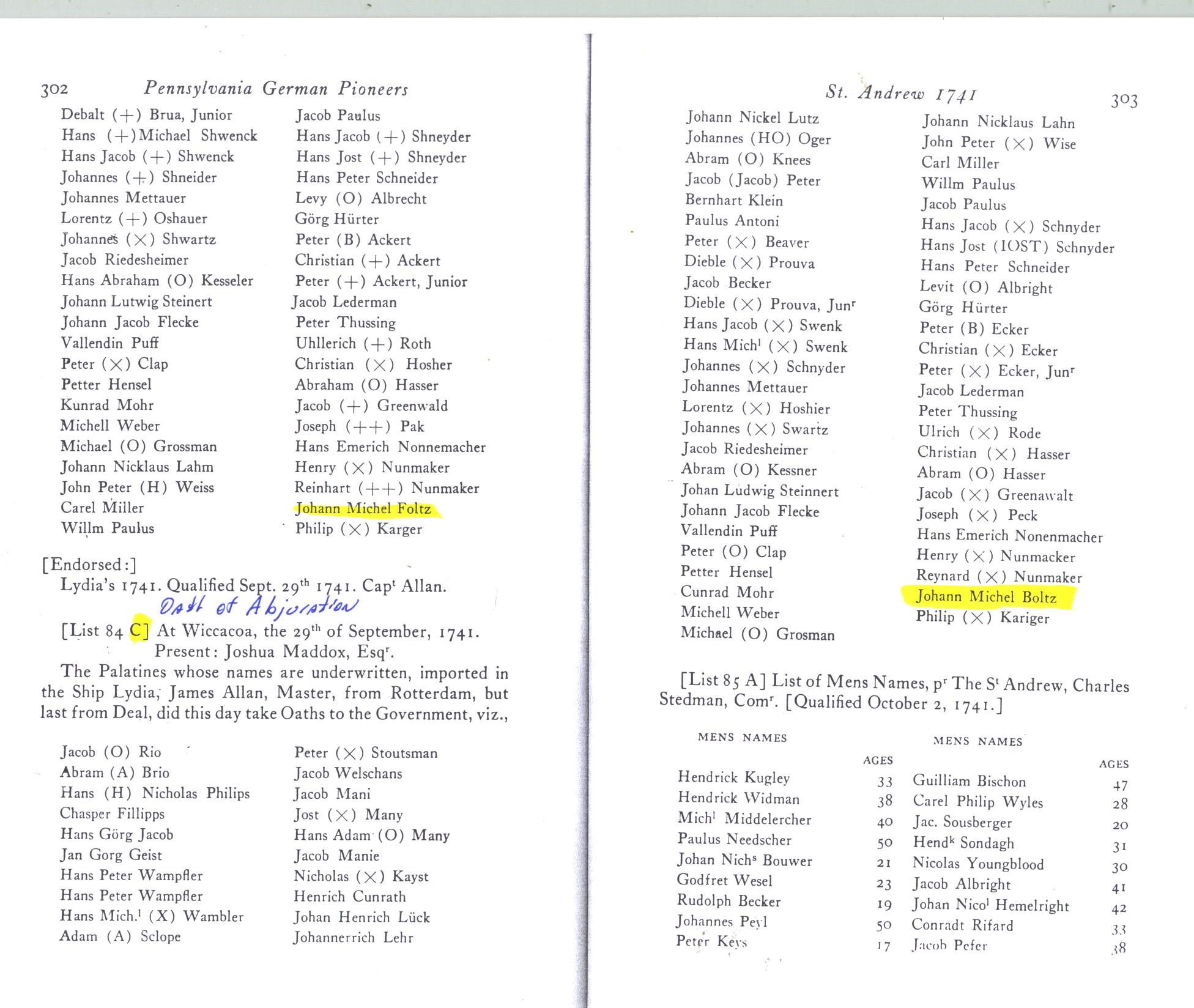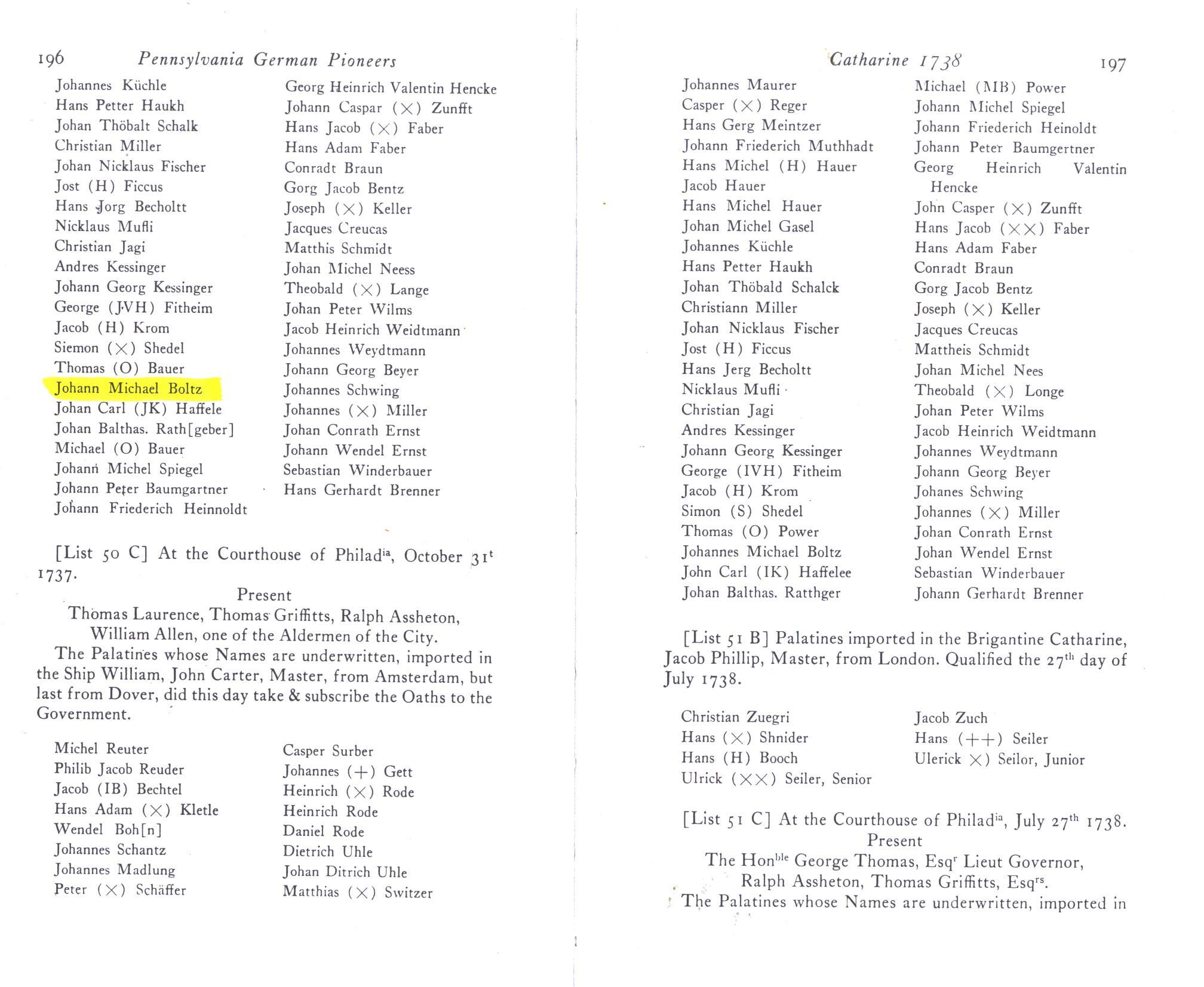 From Charles Van Os 7/29/2010: Source: 30,000 Names, German Swiss Dutch French Immigrating to Pennsylvania page 112 to 113 Scanned document availableSource: Pennsylvania German Pioneers, Volume I 1727-1775 Page 194 to 197 & 200 -202 - Note 50A List prepaired by Captain of William Johans Mekell Pultz; 50B Oath of Allegiance to England: Johann Michael Boltz; 50C Denouncing allegiance to German Government: Johannes Michael Boltz; pages 200 & 202 have his actual signatureScanned document available |