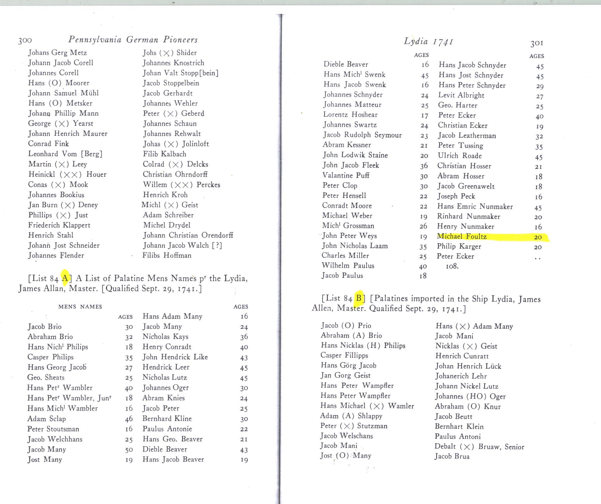 Aka: Michael Foultz; Johann Michel Foltz; (10/31/1737): Johans Mekell Pultz, Johann Michael Boltz, Johannes Michael Boltz, Johan Michael Boltz; |