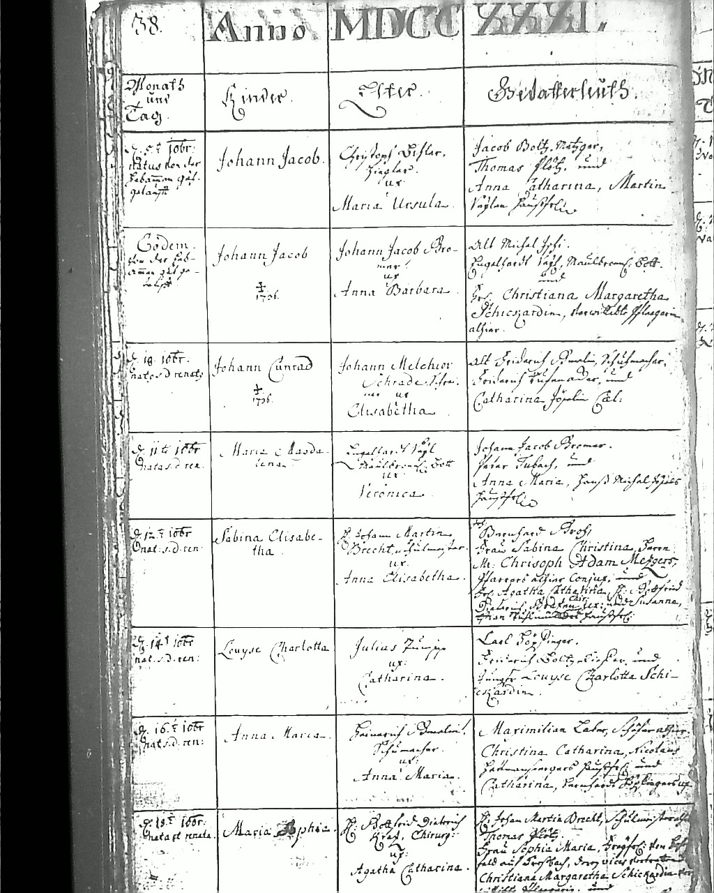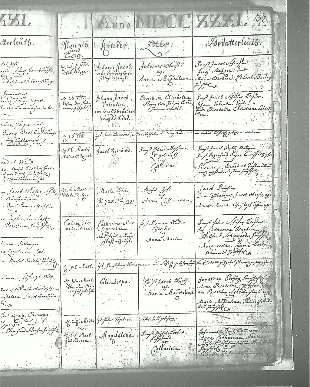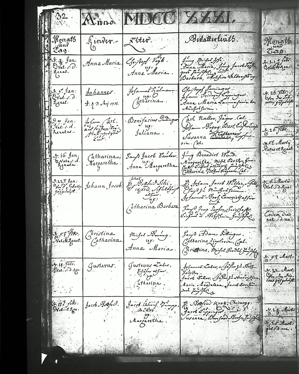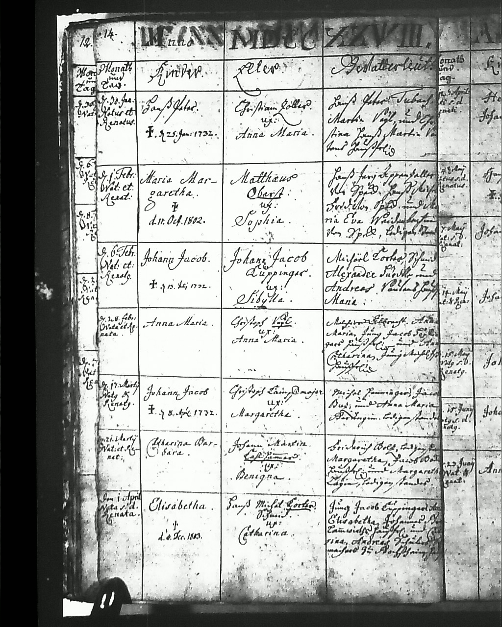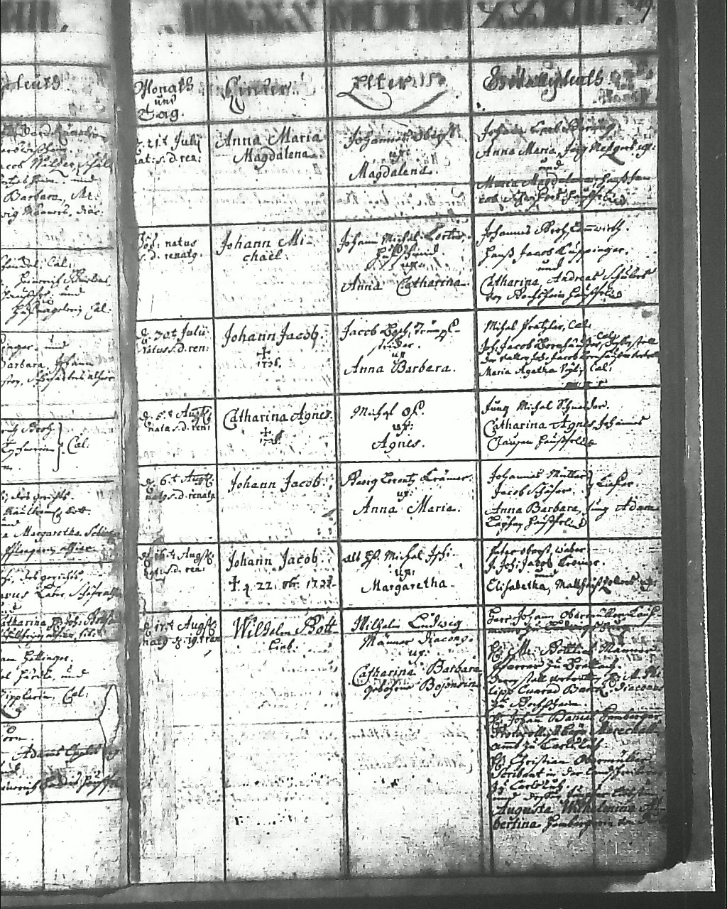 6 February; Christening: John Jacob died 1732; Parents: Jacob Boltz; Magualena; sponsors: Mathew Zoller + 2 more