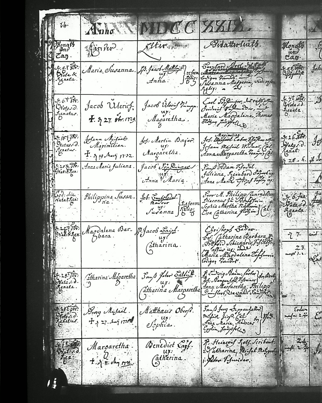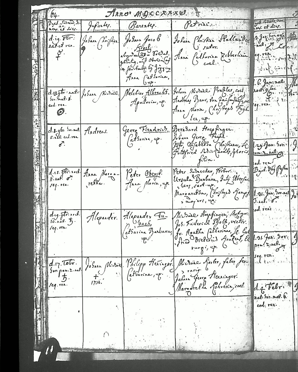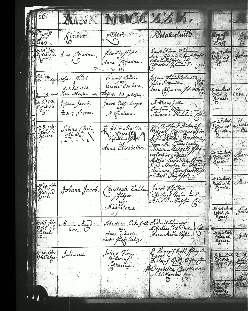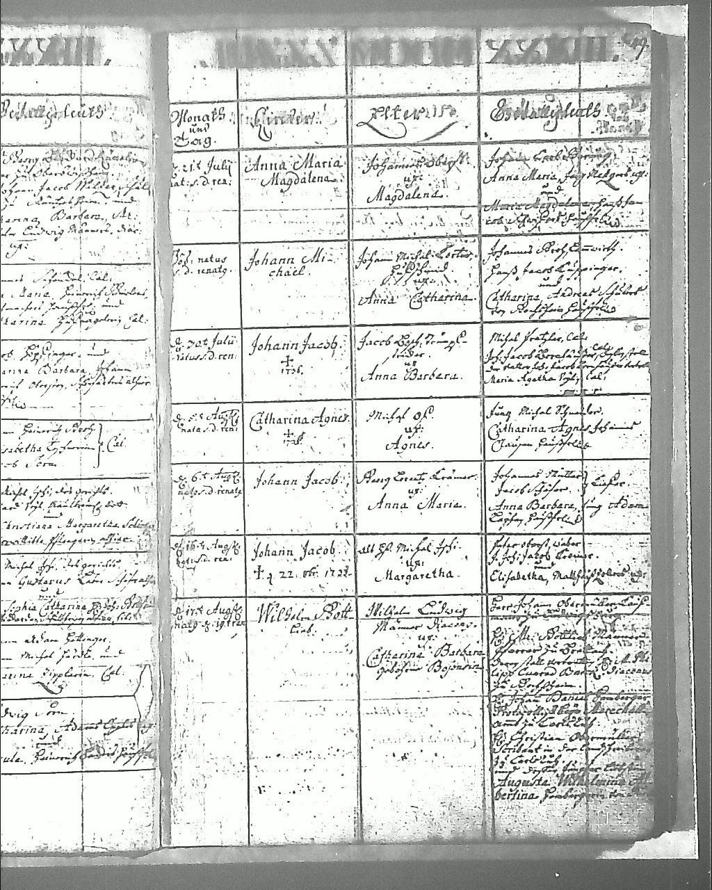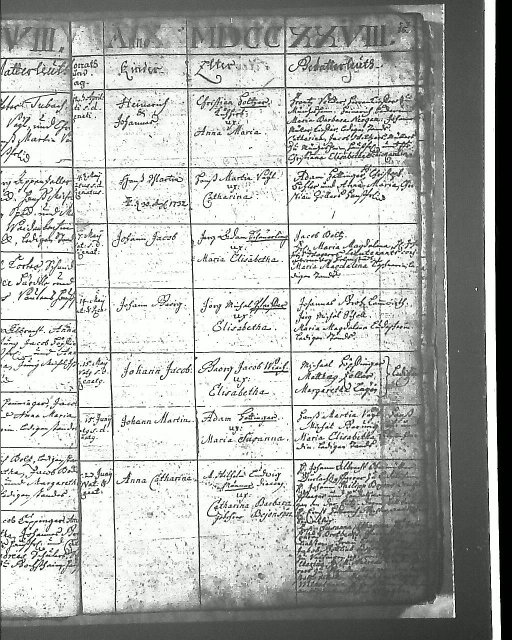 6 February; Christening: John Jacob died 1732; Parents: Jacob Boltz; Magualena; sponsors: Mathew Zoller + 2 more