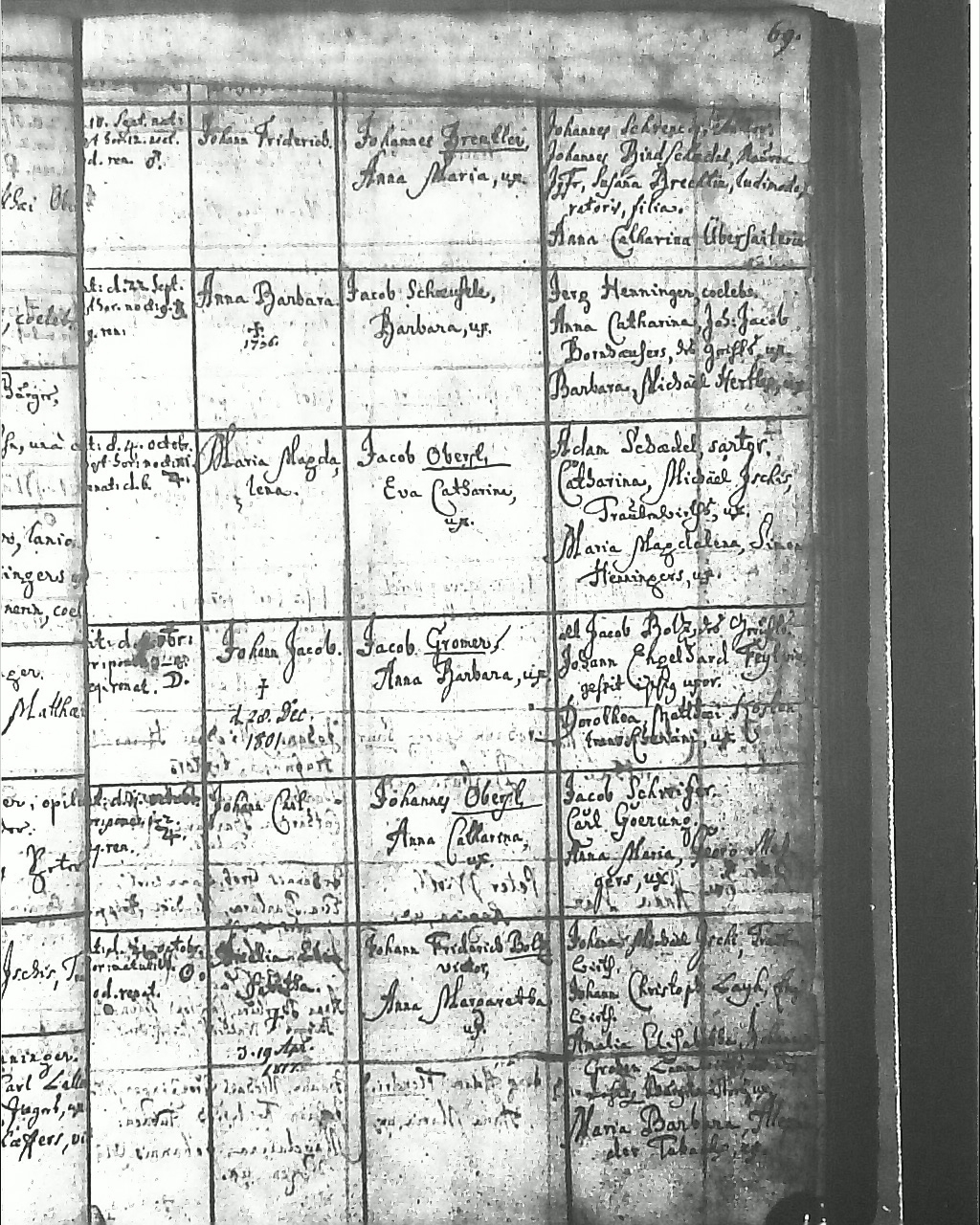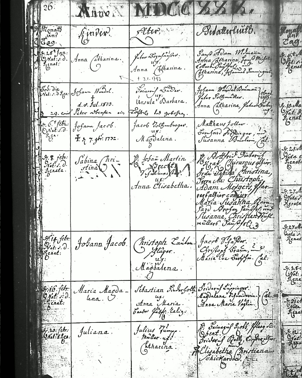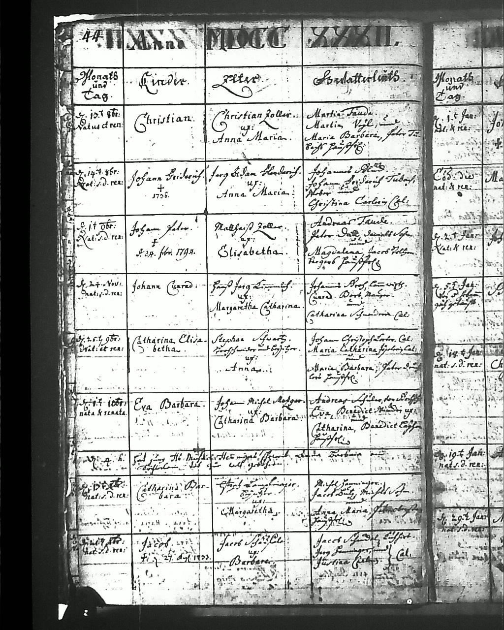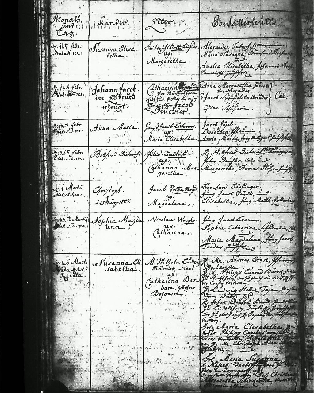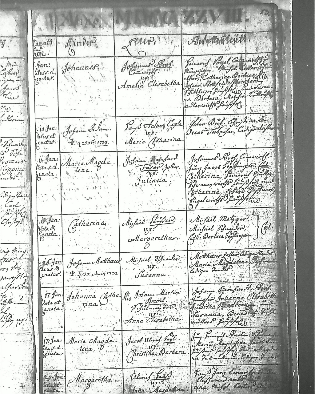 6 February; Christening: John Jacob died 1732; Parents: Jacob Boltz; Magualena; sponsors: Mathew Zoller + 2 more