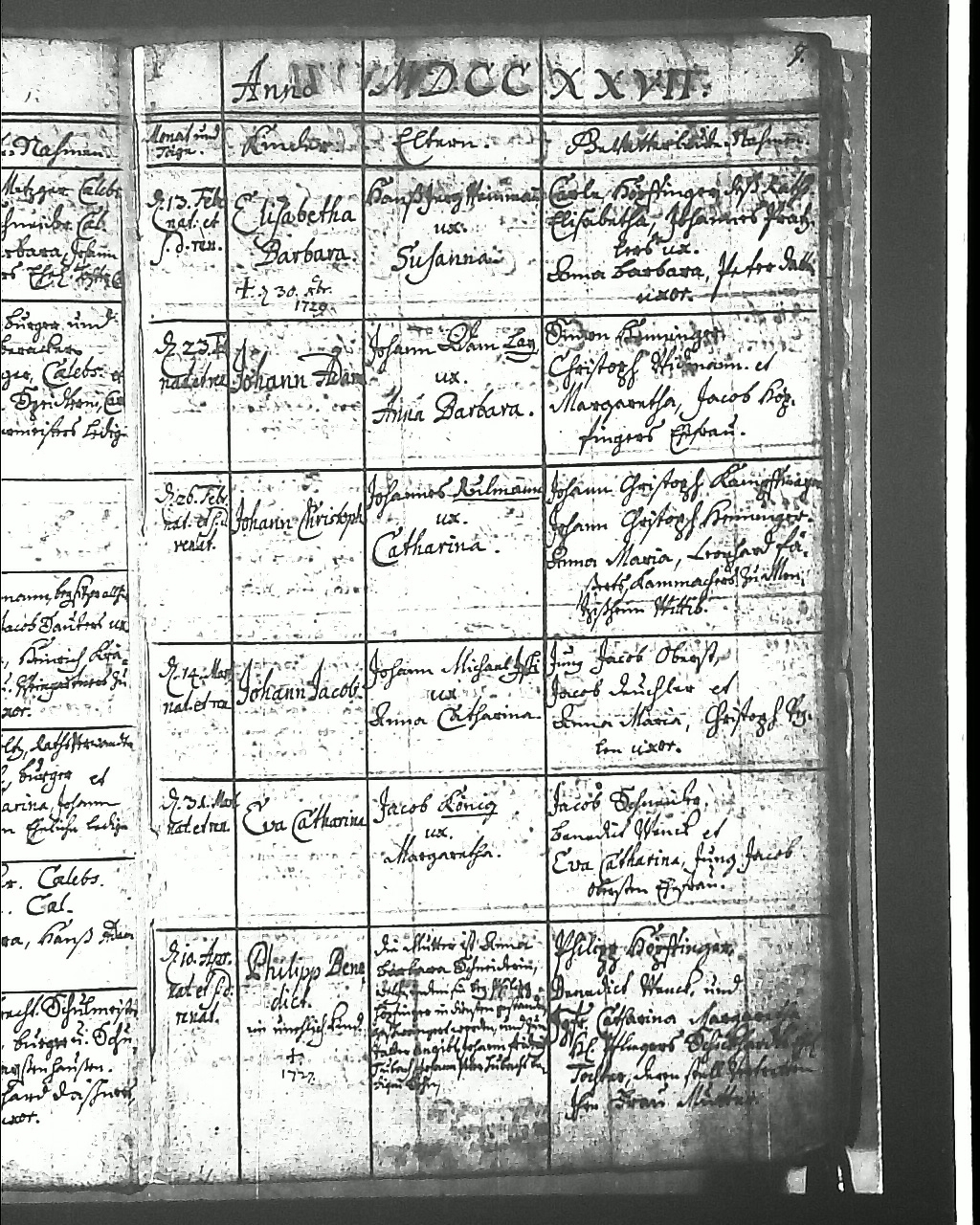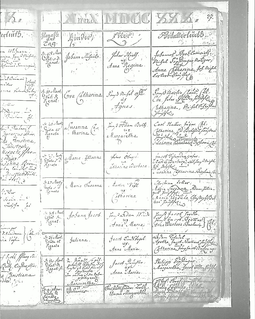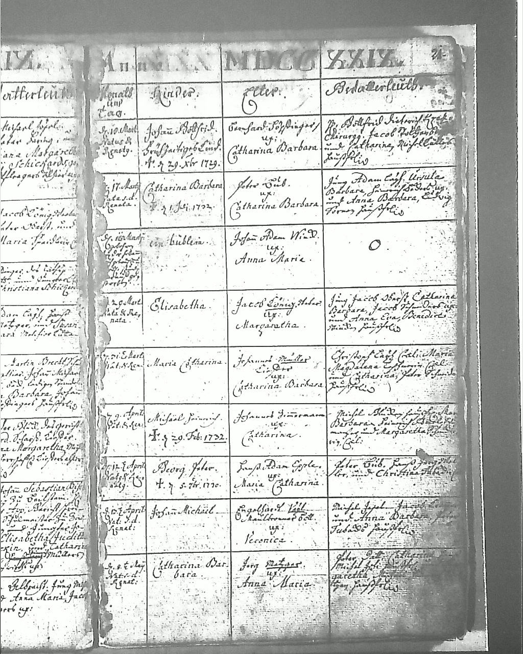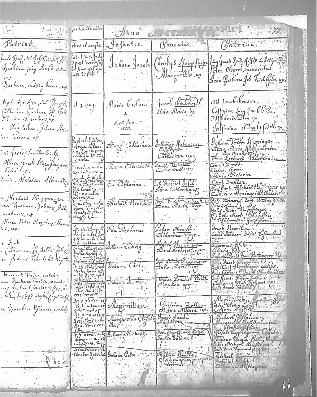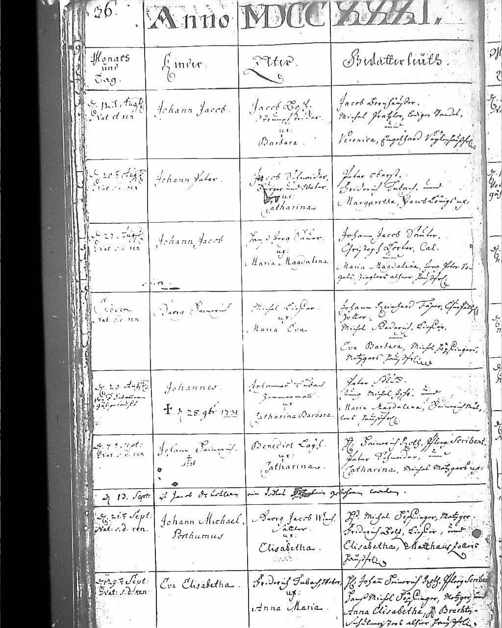 6 February; Christening: John Jacob died 1732; Parents: Jacob Boltz; Magualena; sponsors: Mathew Zoller + 2 more