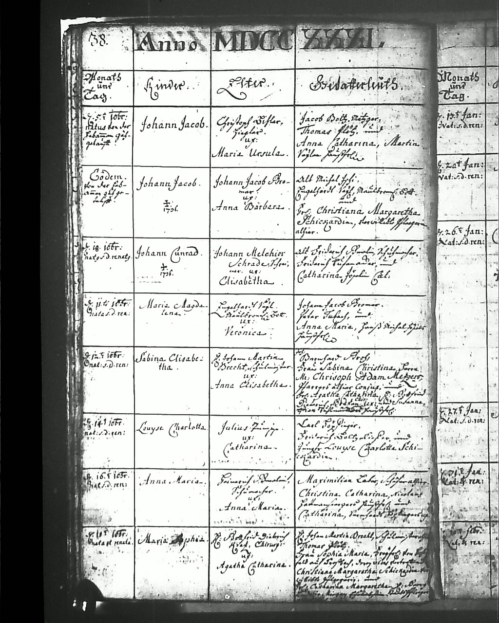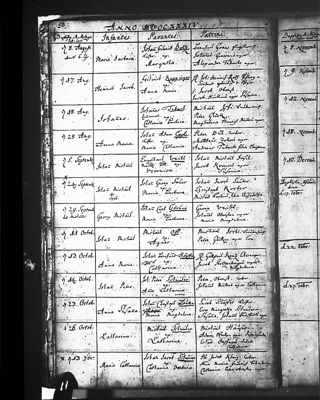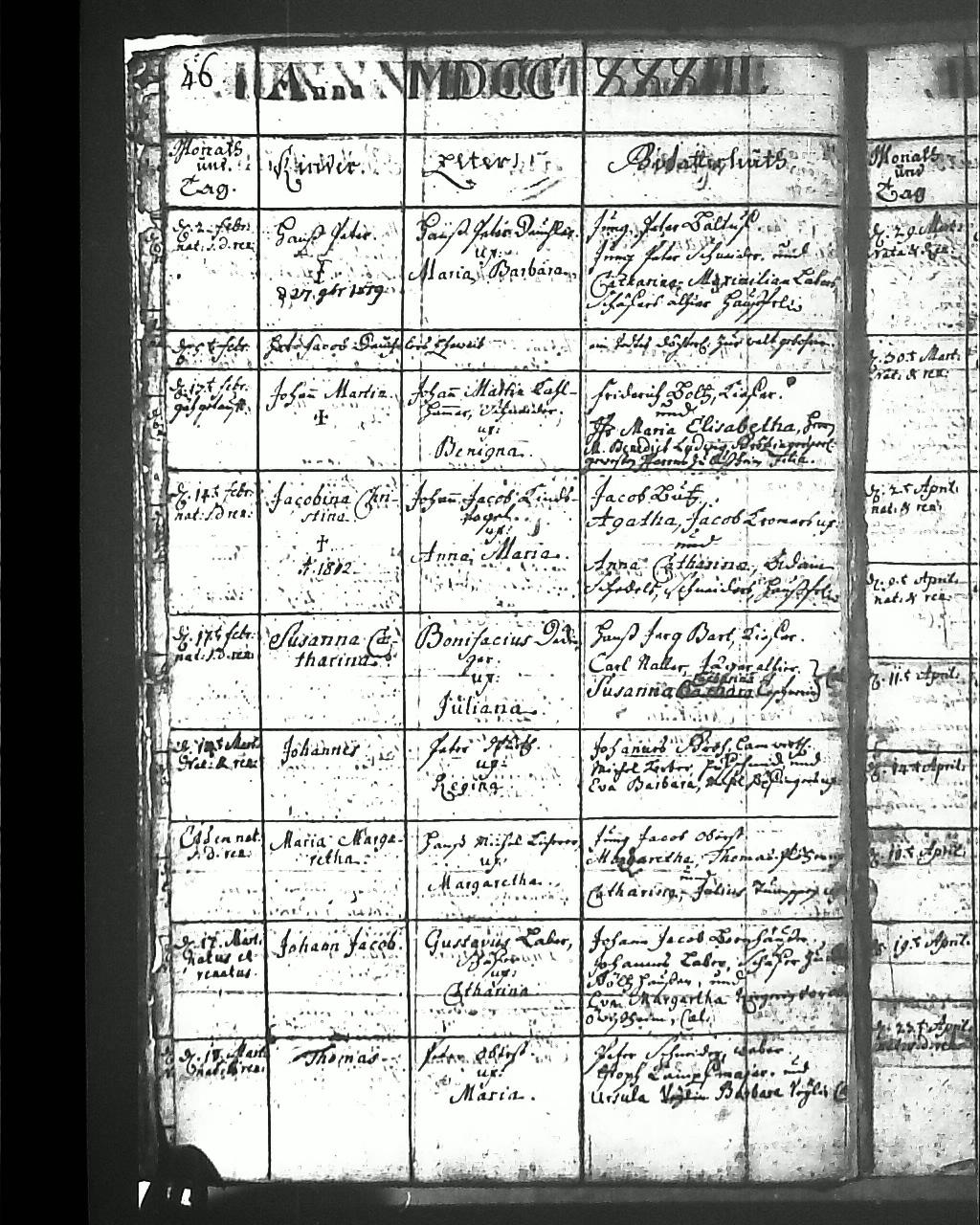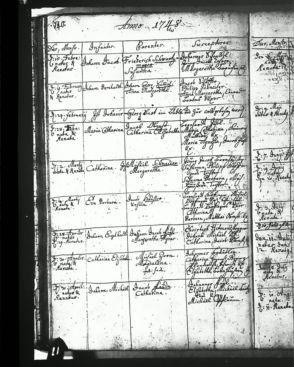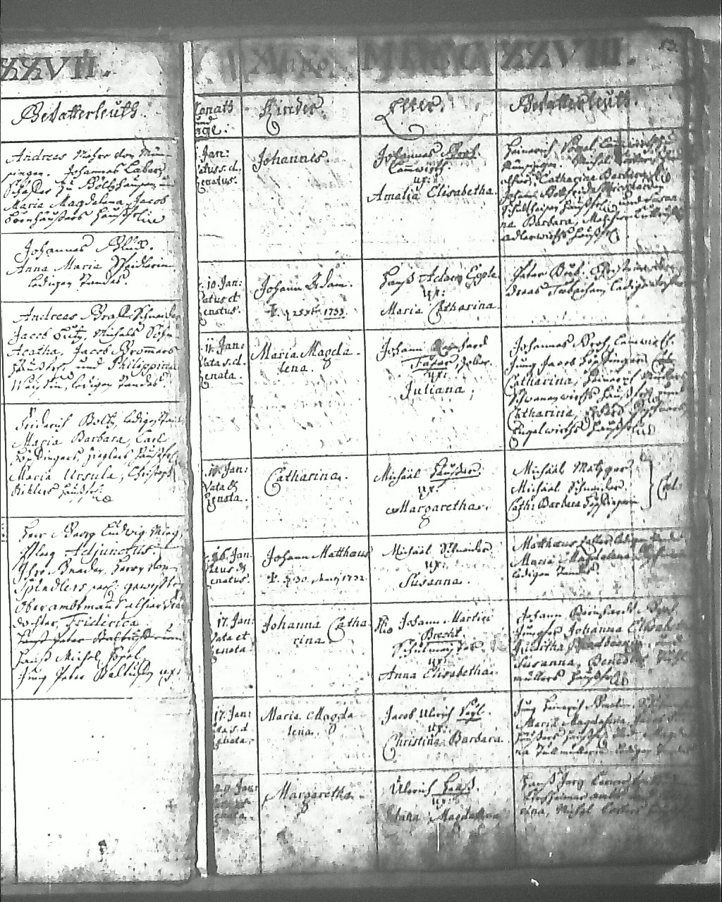 6 February; Christening: John Jacob died 1732; Parents: Jacob Boltz; Magualena; sponsors: Mathew Zoller + 2 more