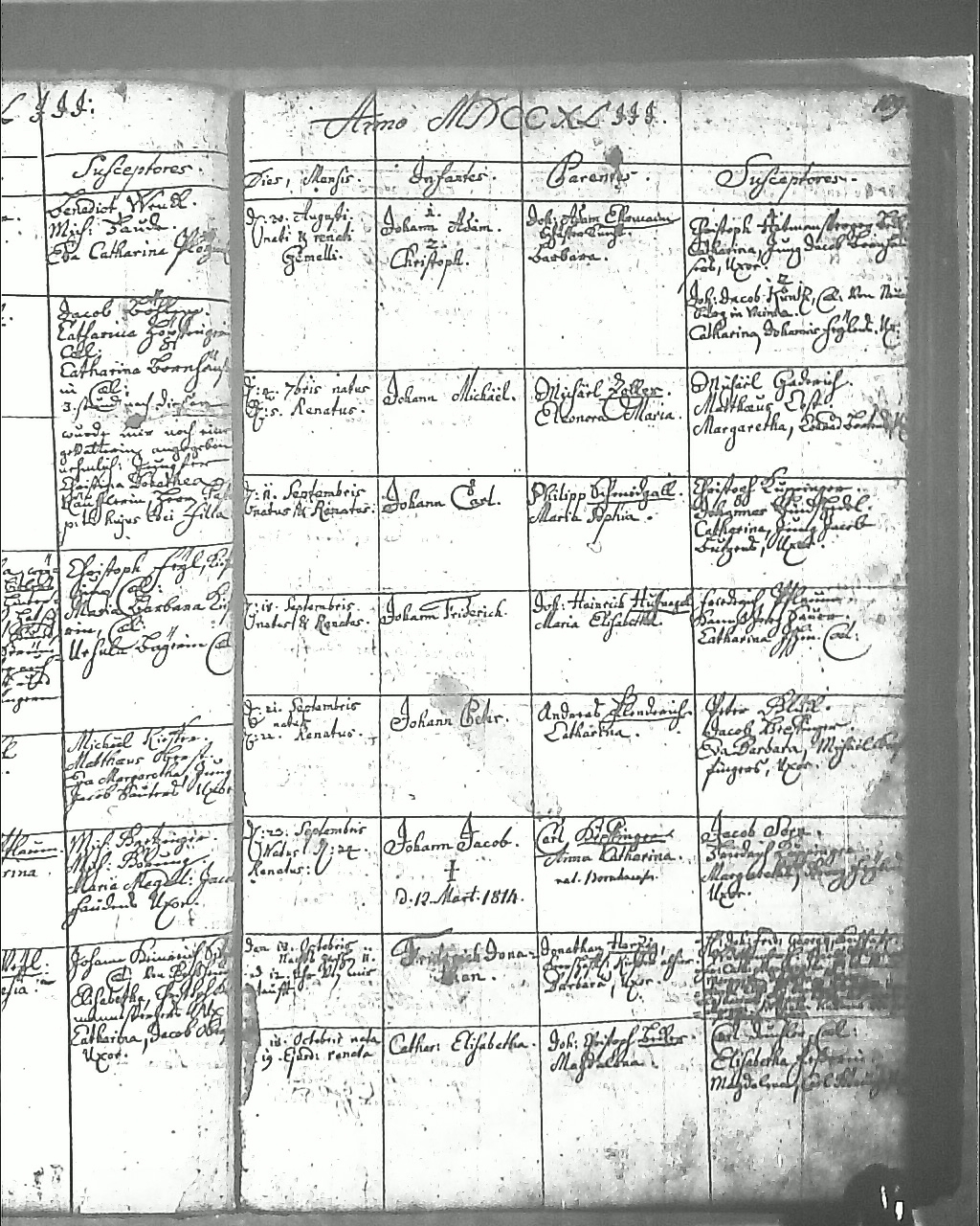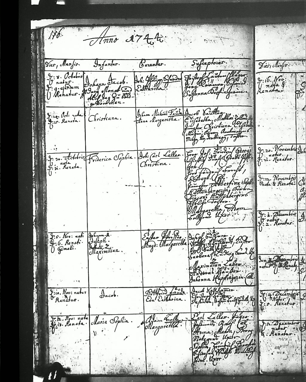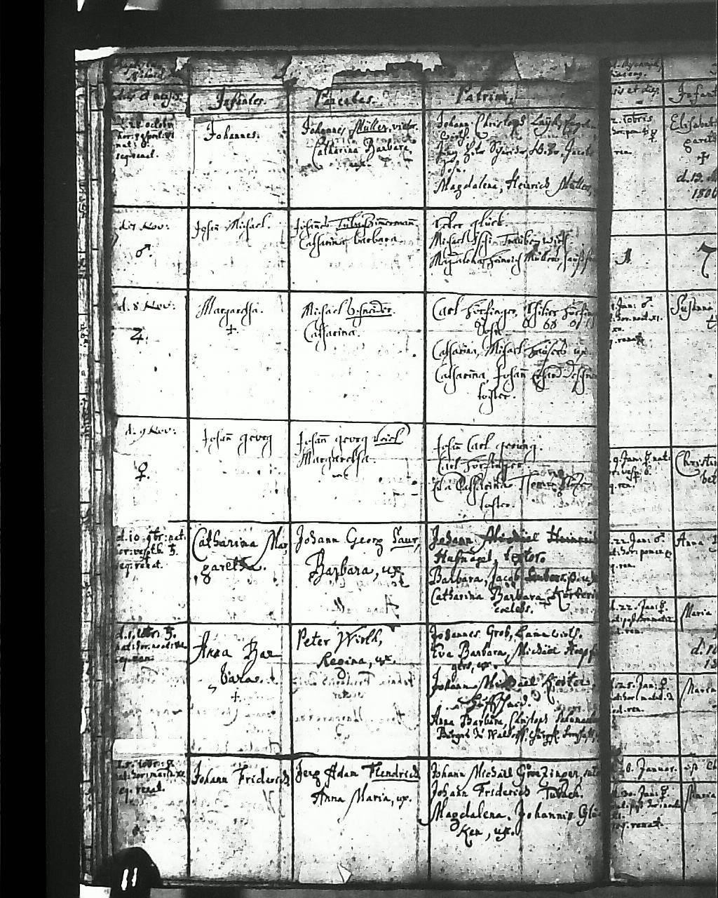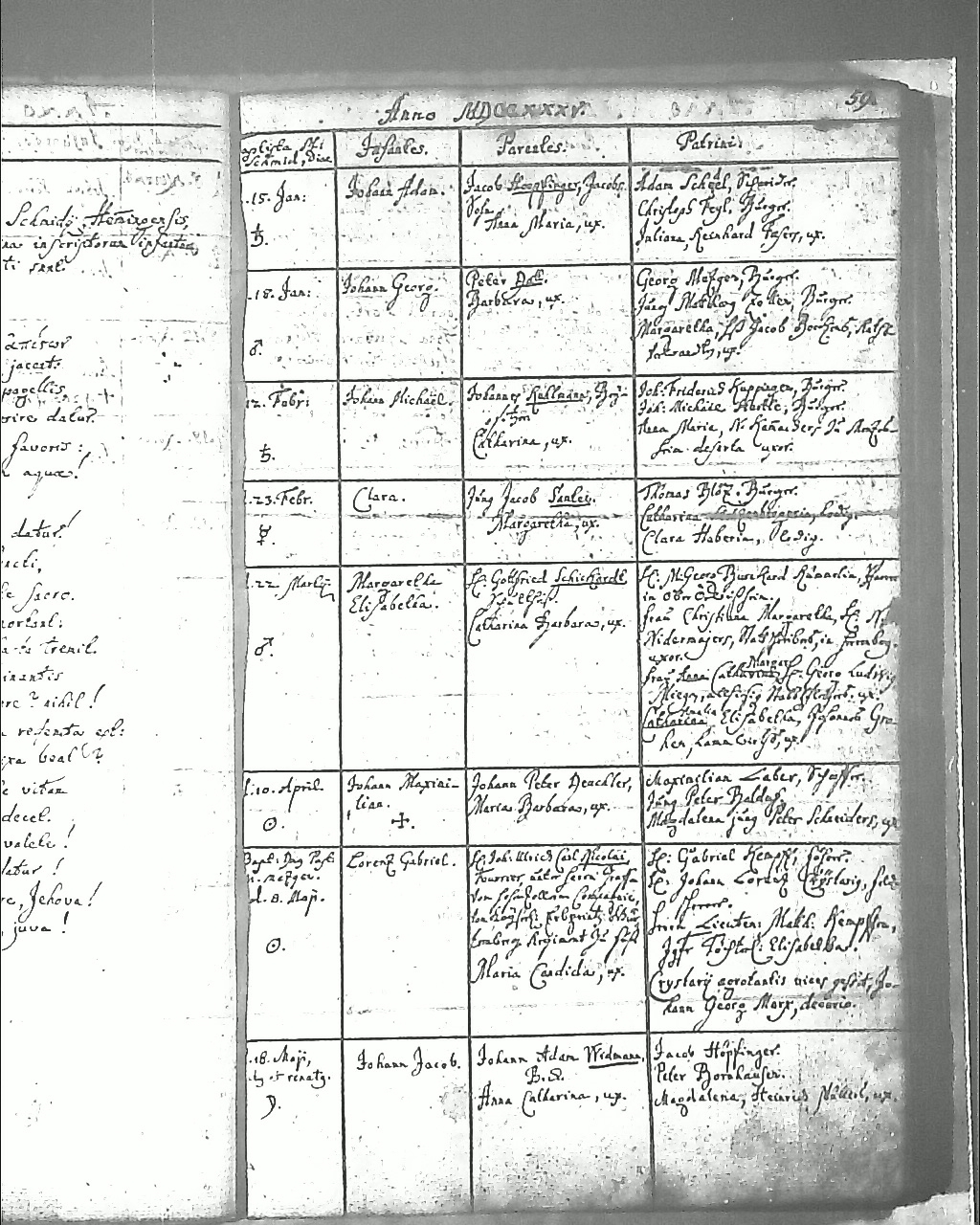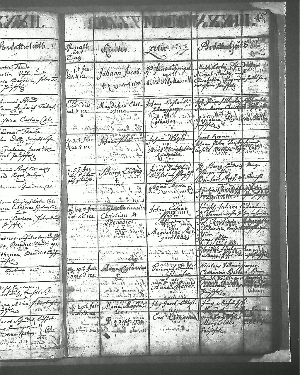 6 February; Christening: John Jacob died 1732; Parents: Jacob Boltz; Magualena; sponsors: Mathew Zoller + 2 more