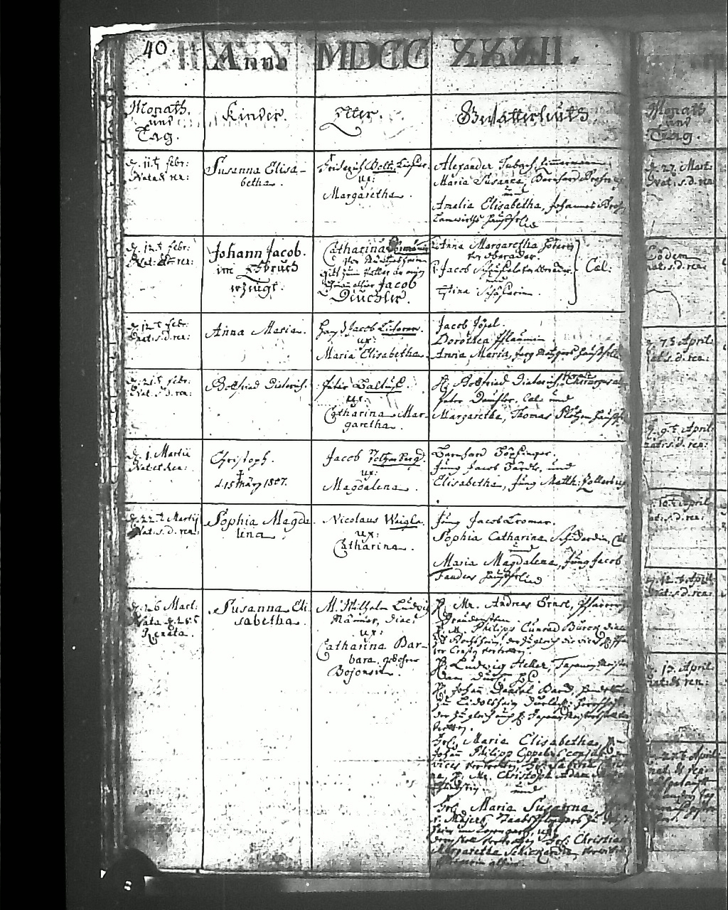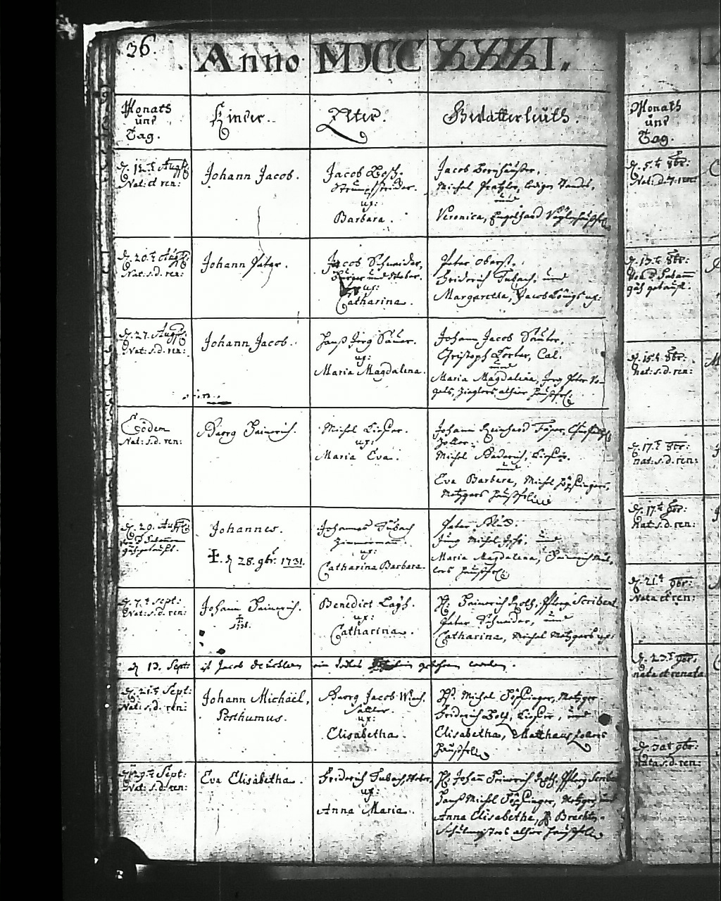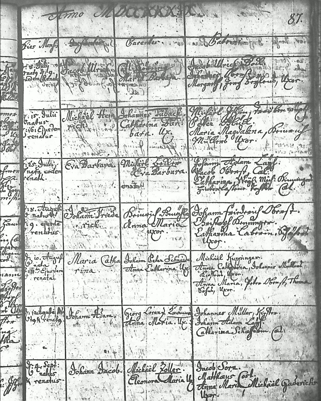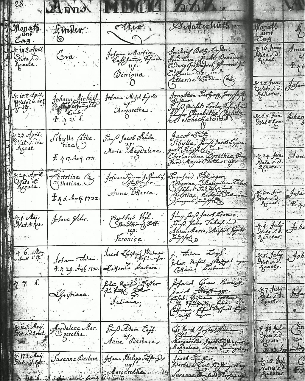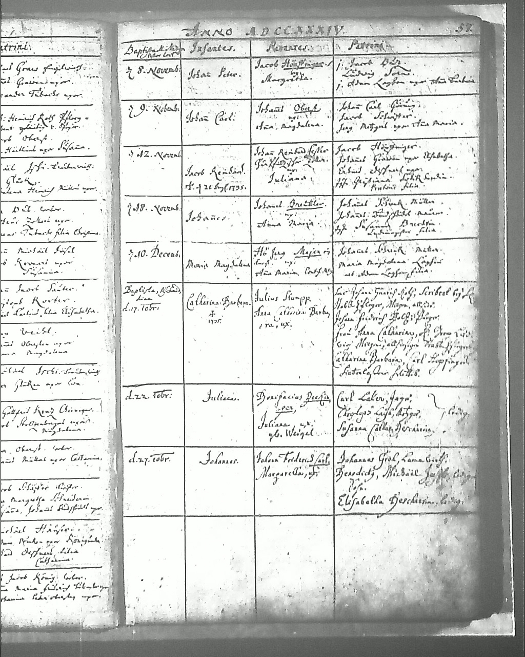 6 February; Christening: John Jacob died 1732; Parents: Jacob Boltz; Magualena; sponsors: Mathew Zoller + 2 more