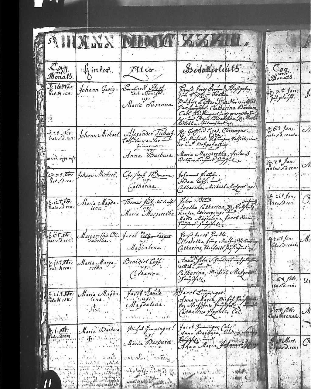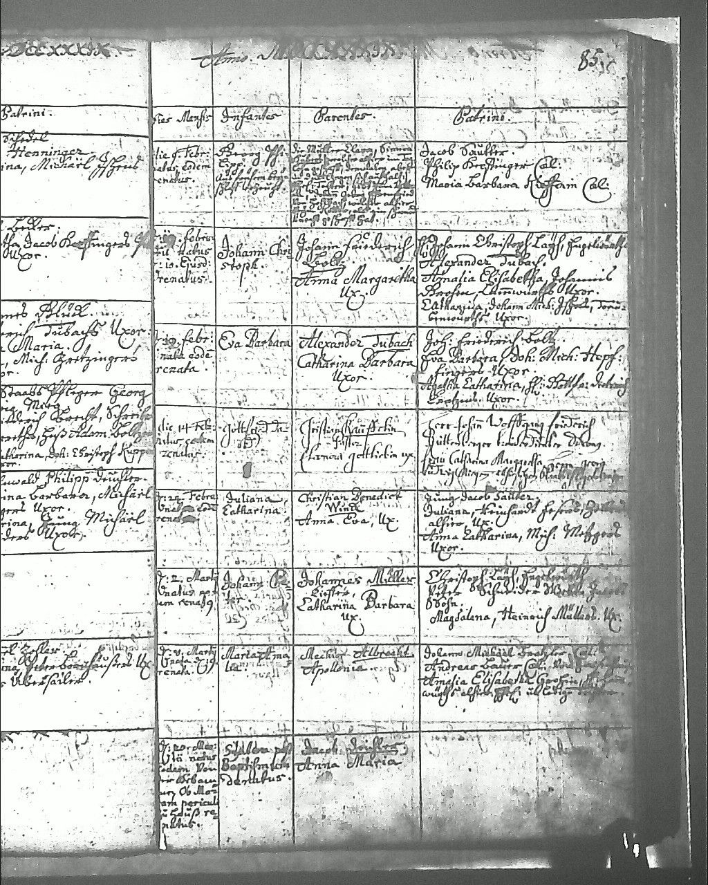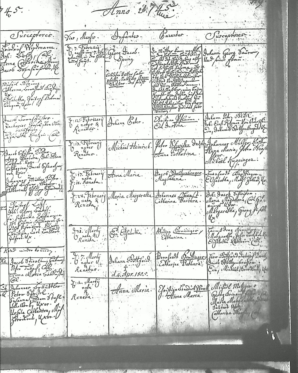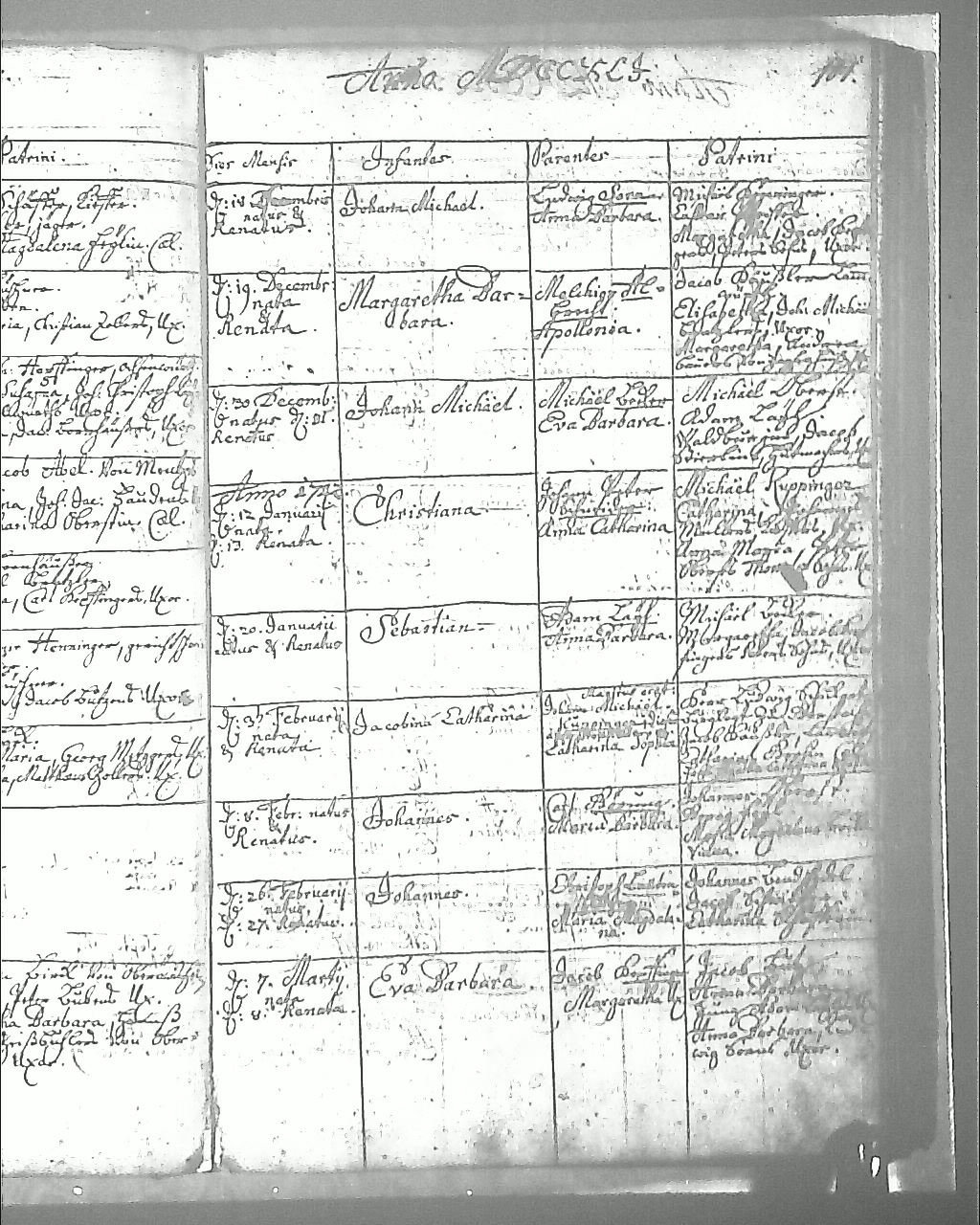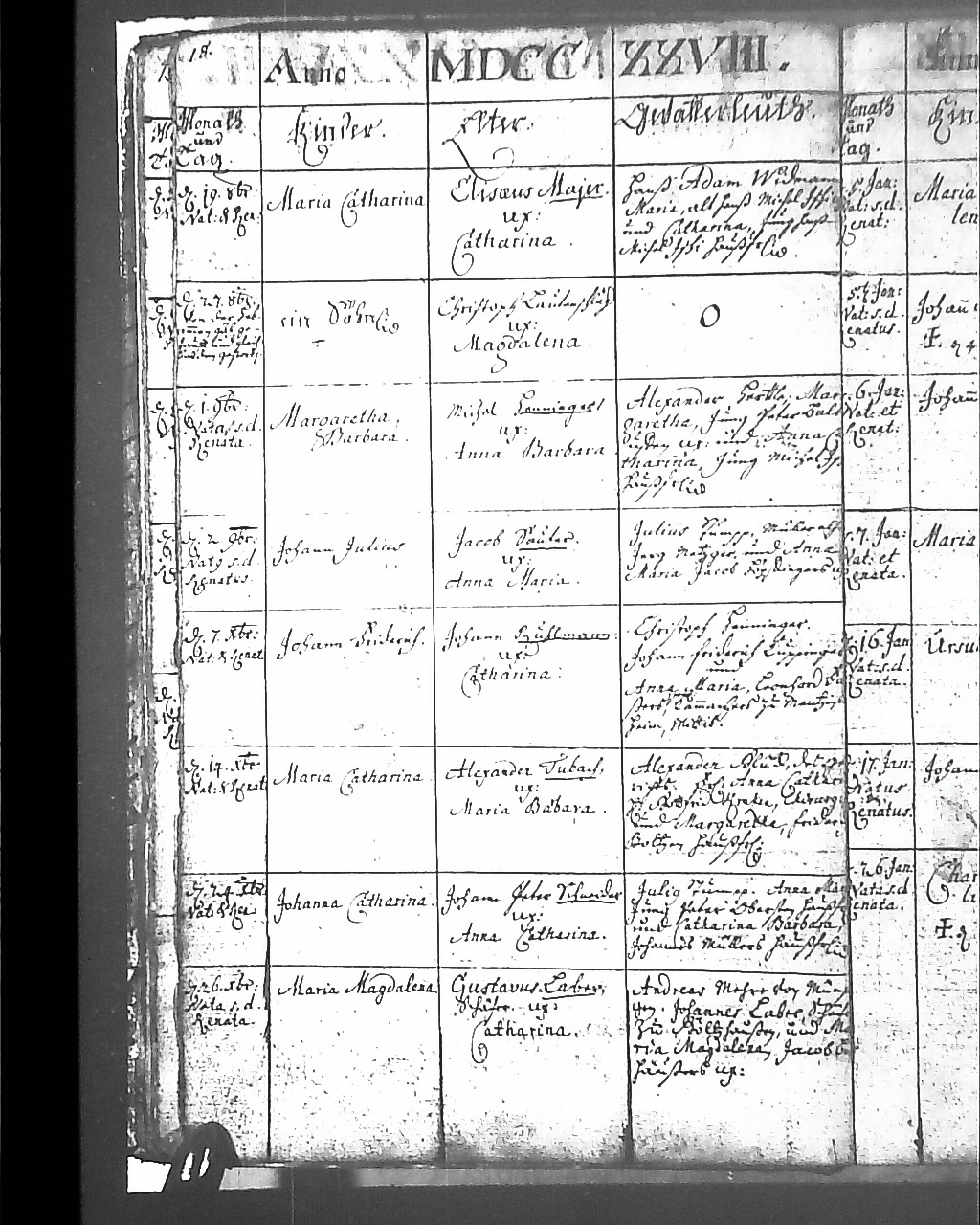 16 February; Christening: Maria Magualena; Parents: Sebastain Gindar Boltz; Anna Maria; sponsors: 3