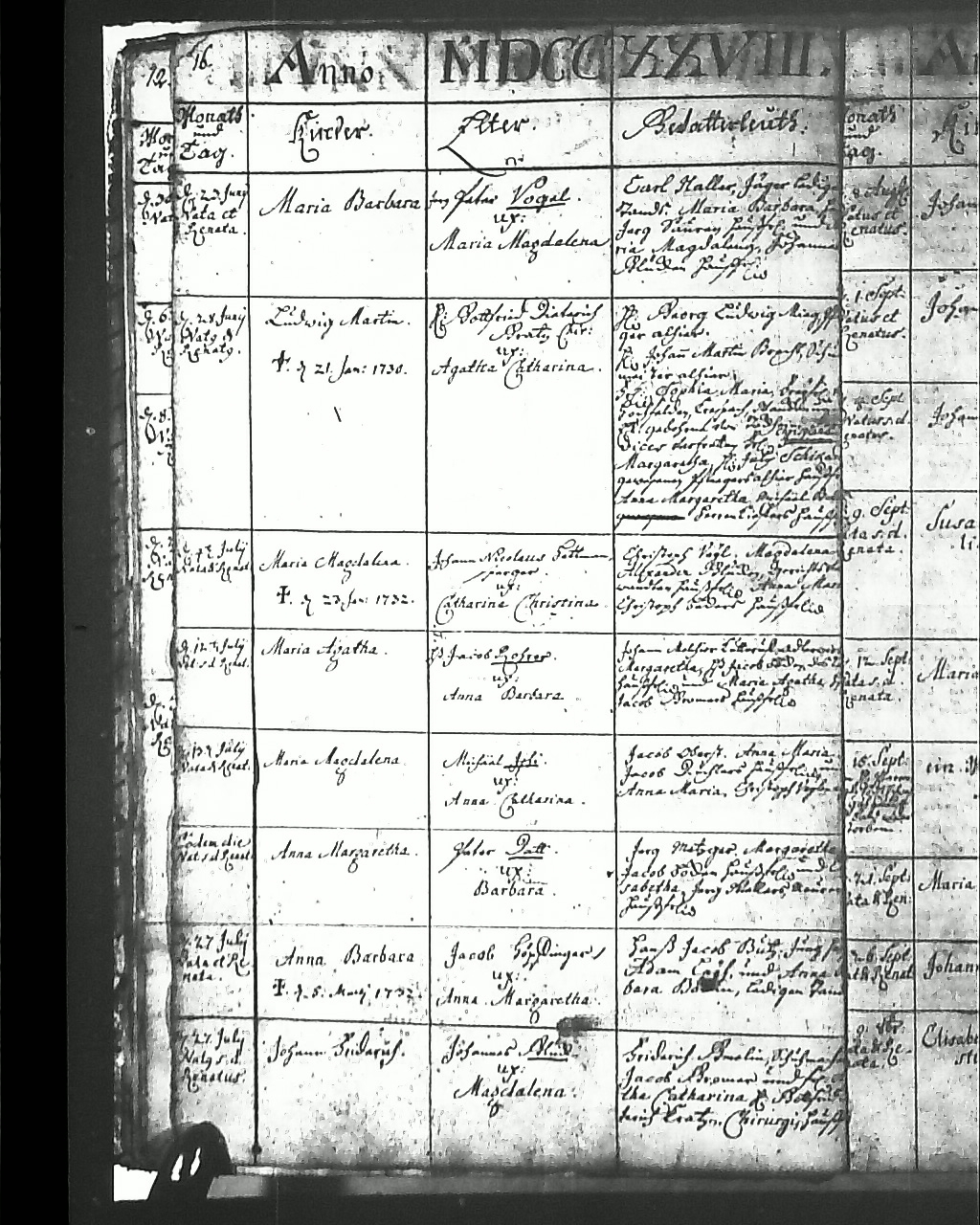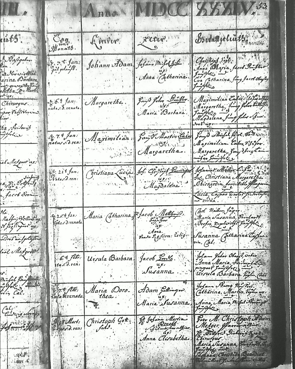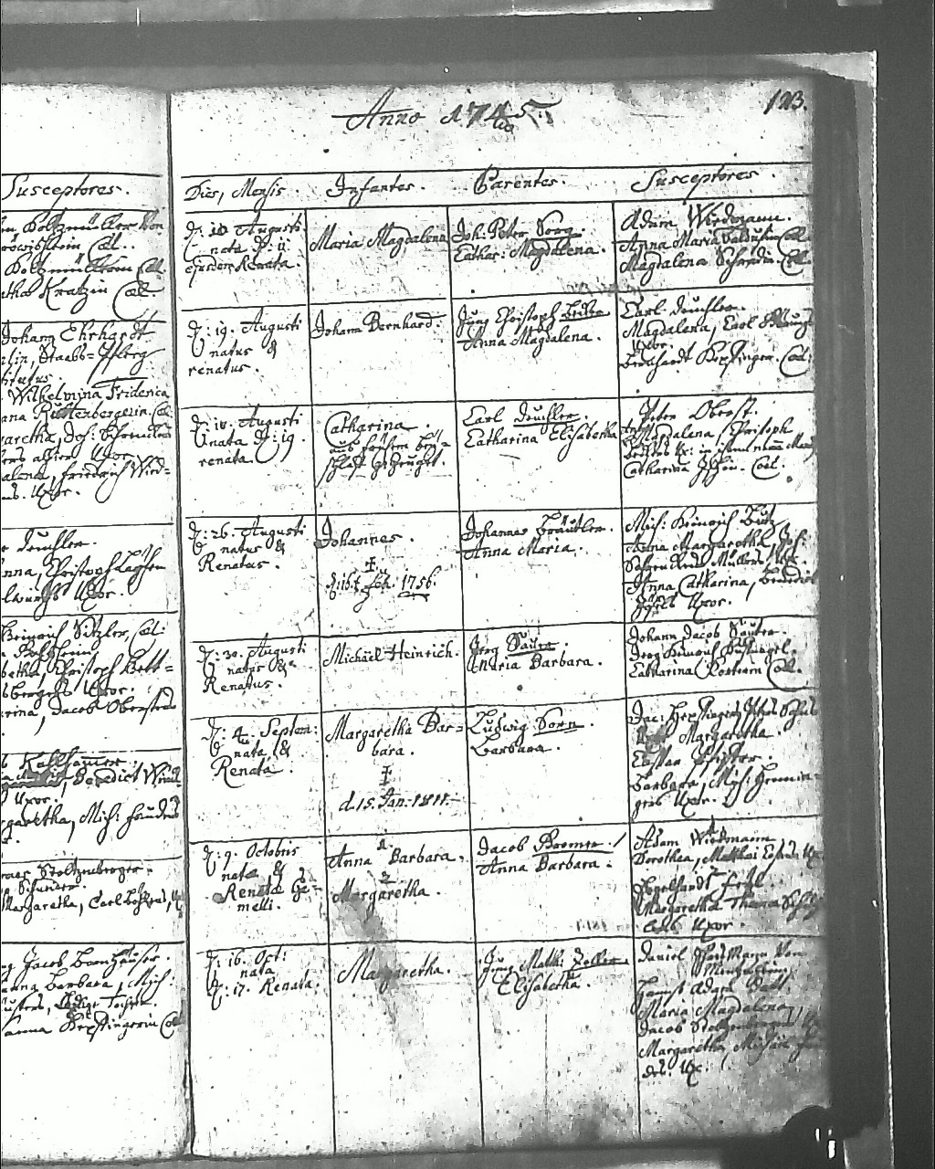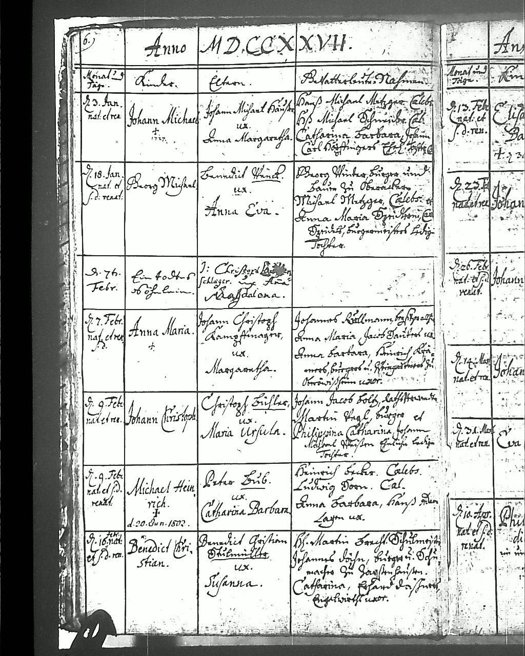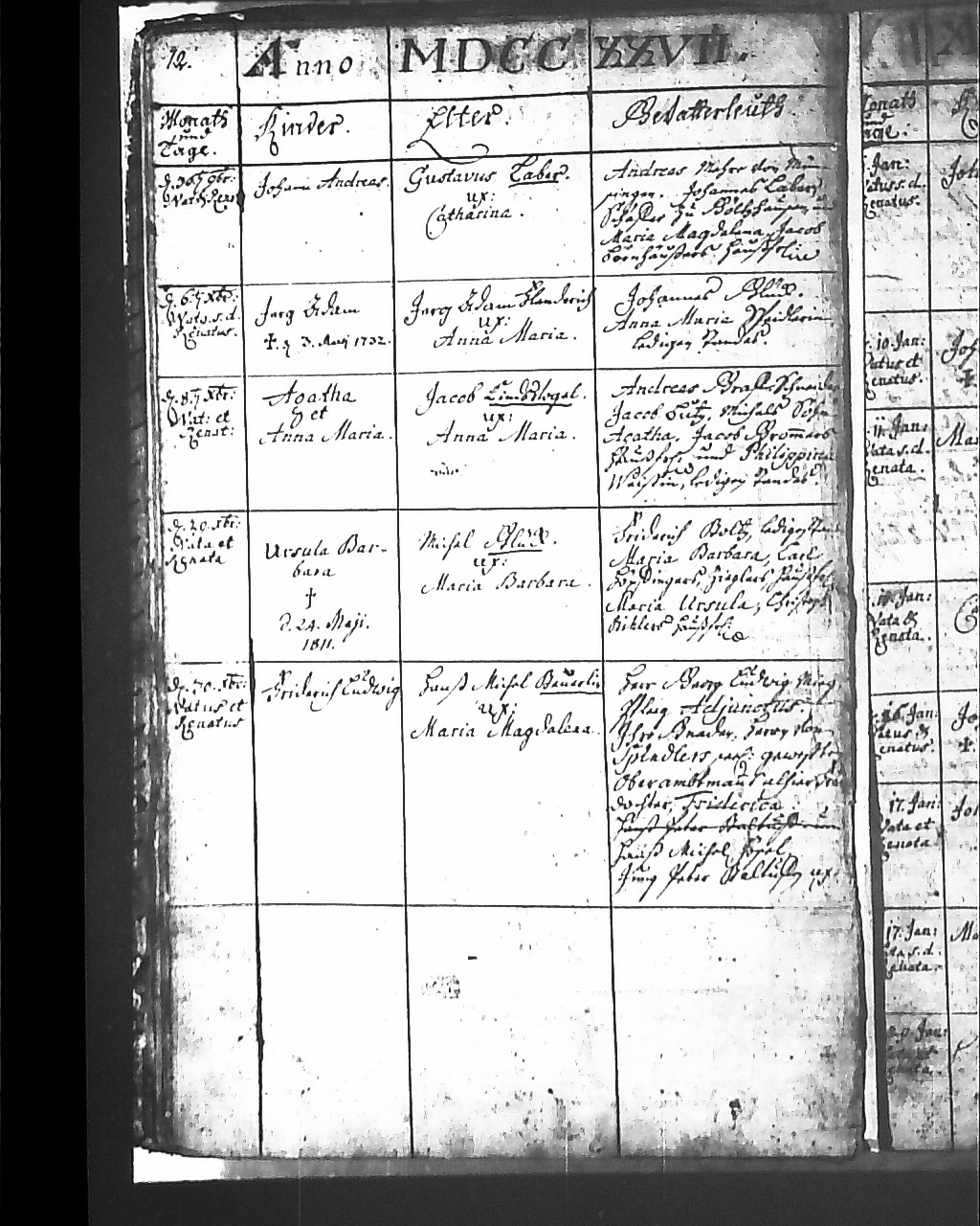 16 February; Christening: Maria Magualena; Parents: Sebastain Gindar Boltz; Anna Maria; sponsors: 3