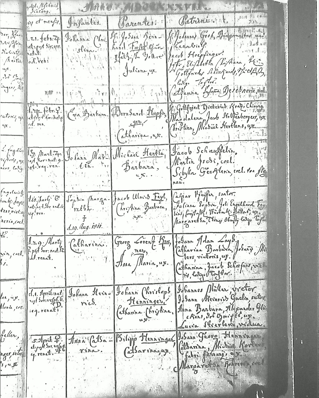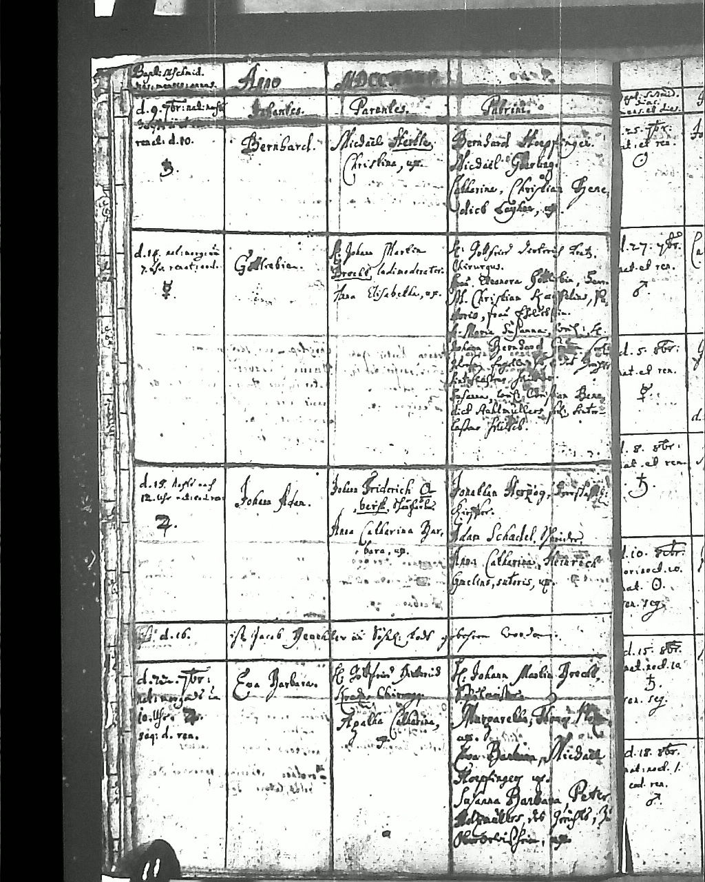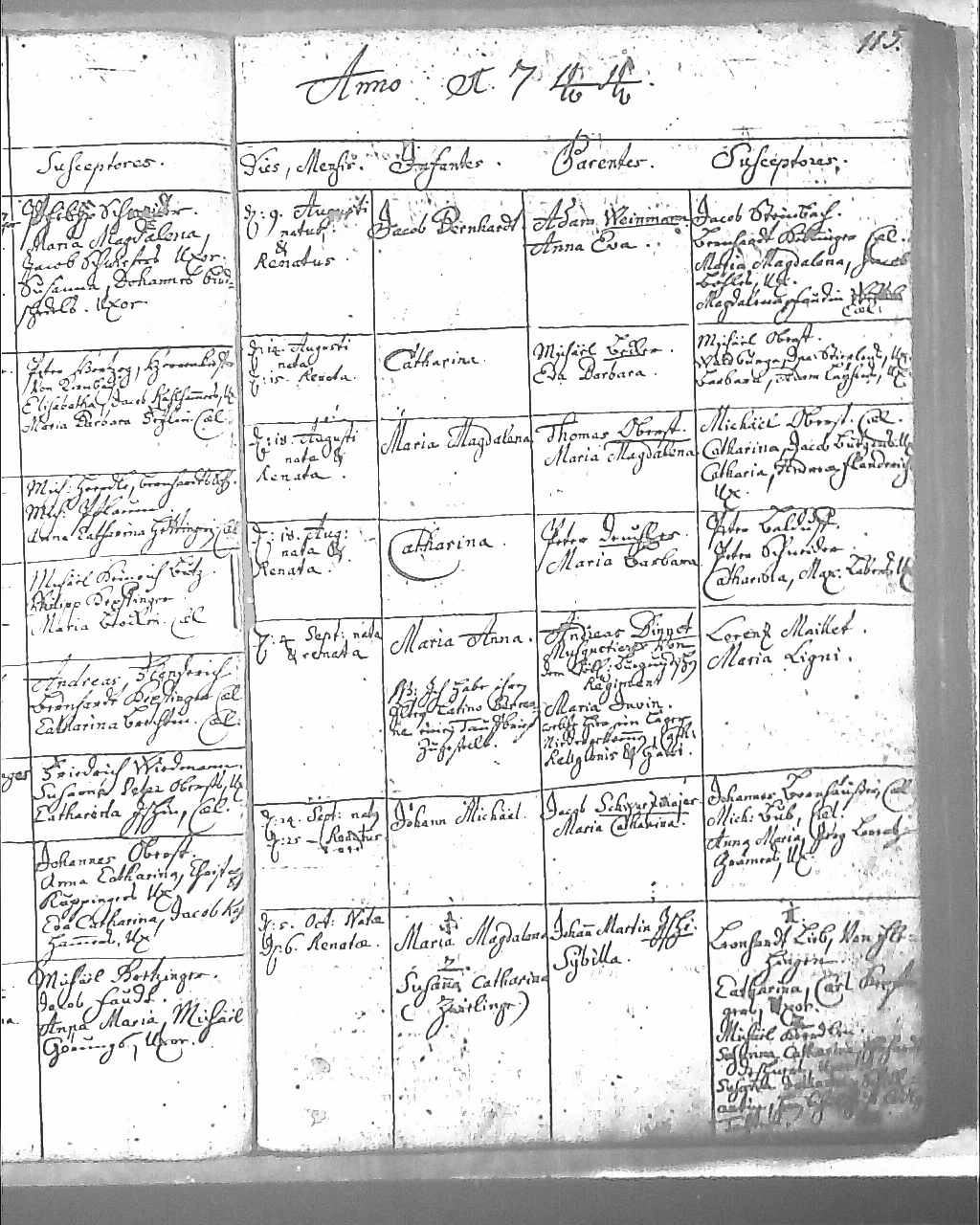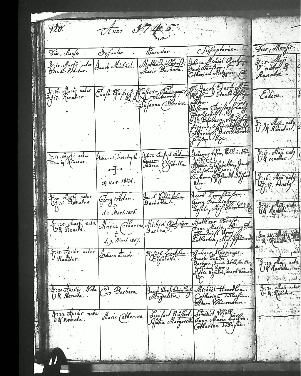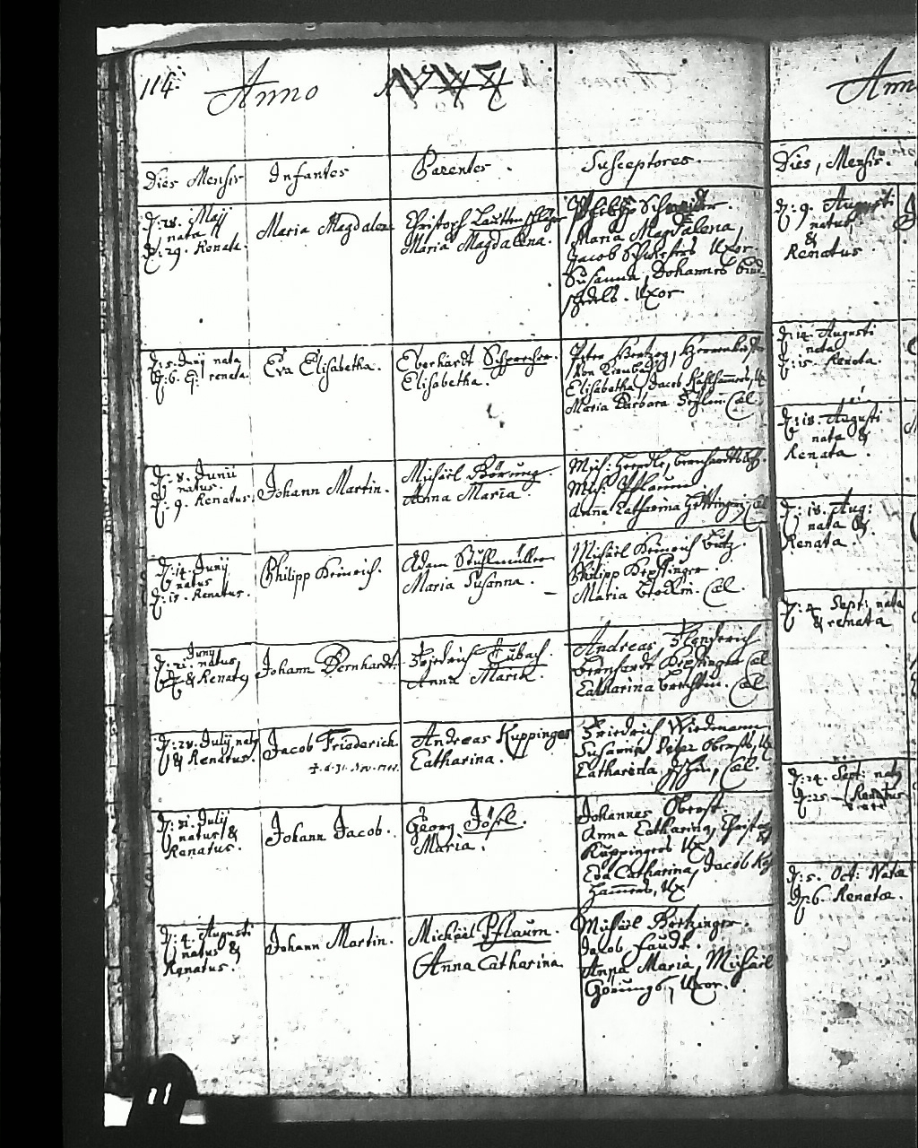 16 February; Christening: Maria Magualena; Parents: Sebastain Gindar Boltz; Anna Maria; sponsors: 3