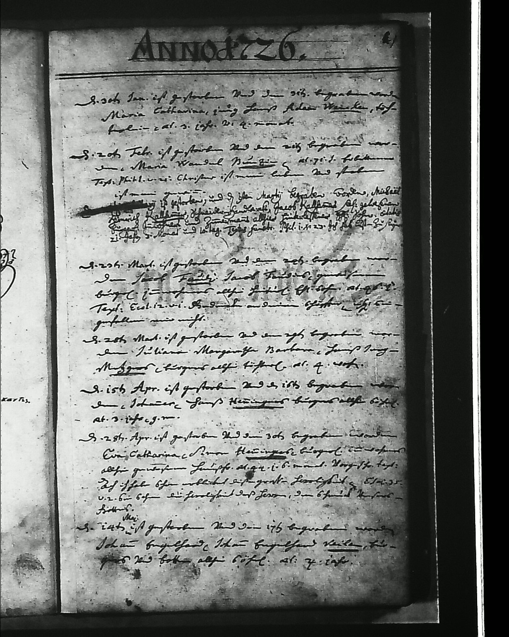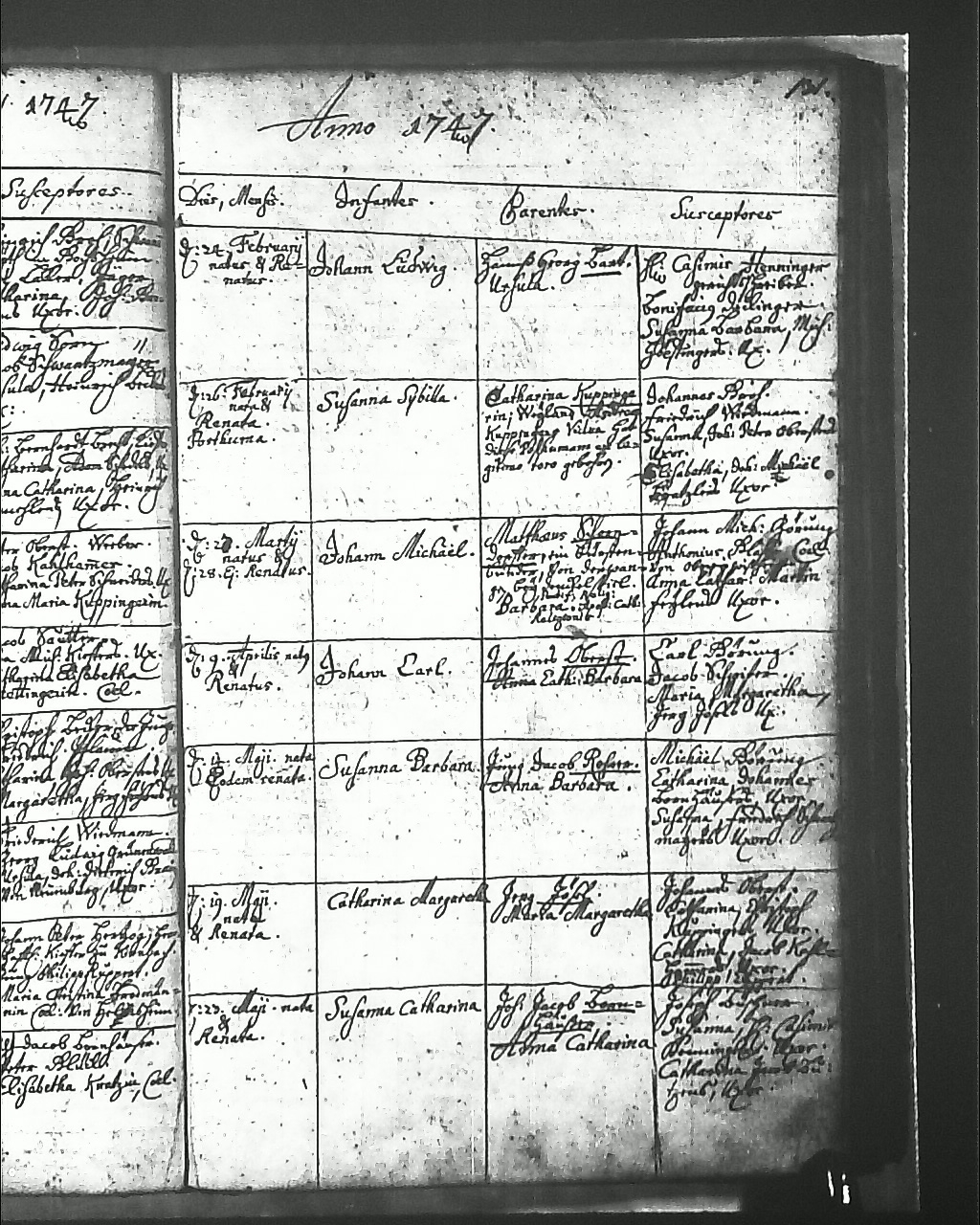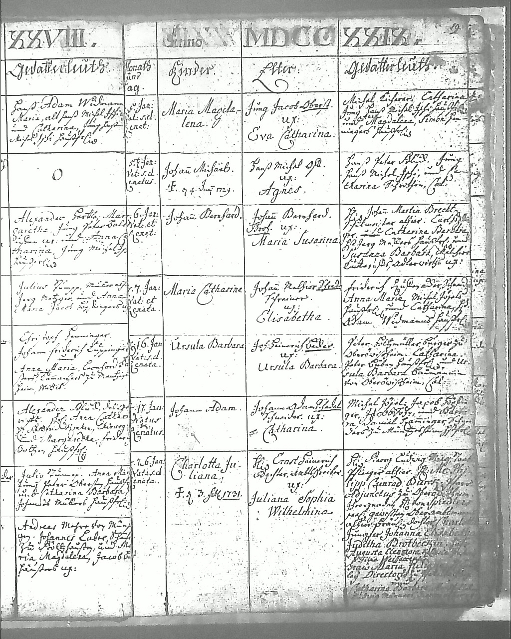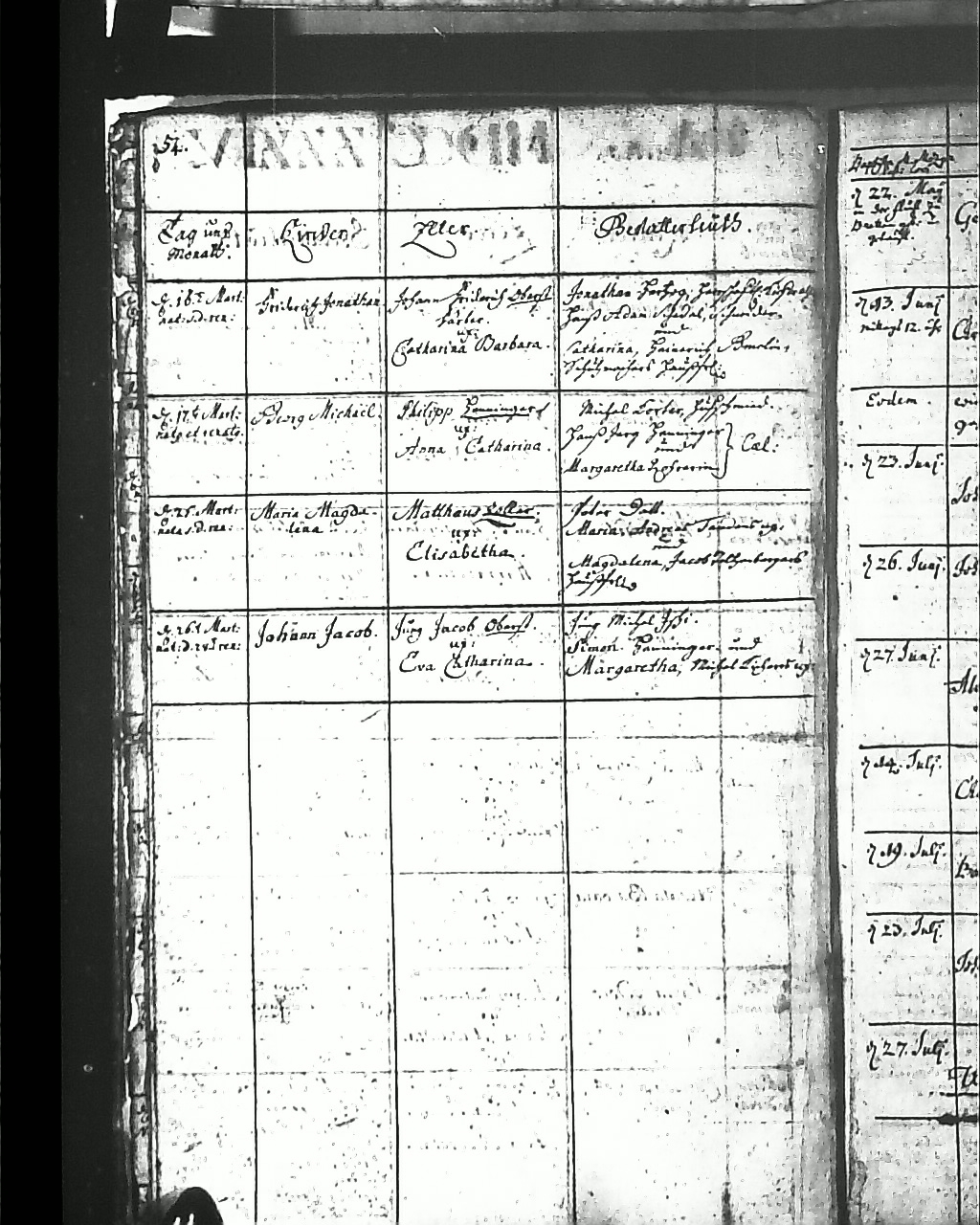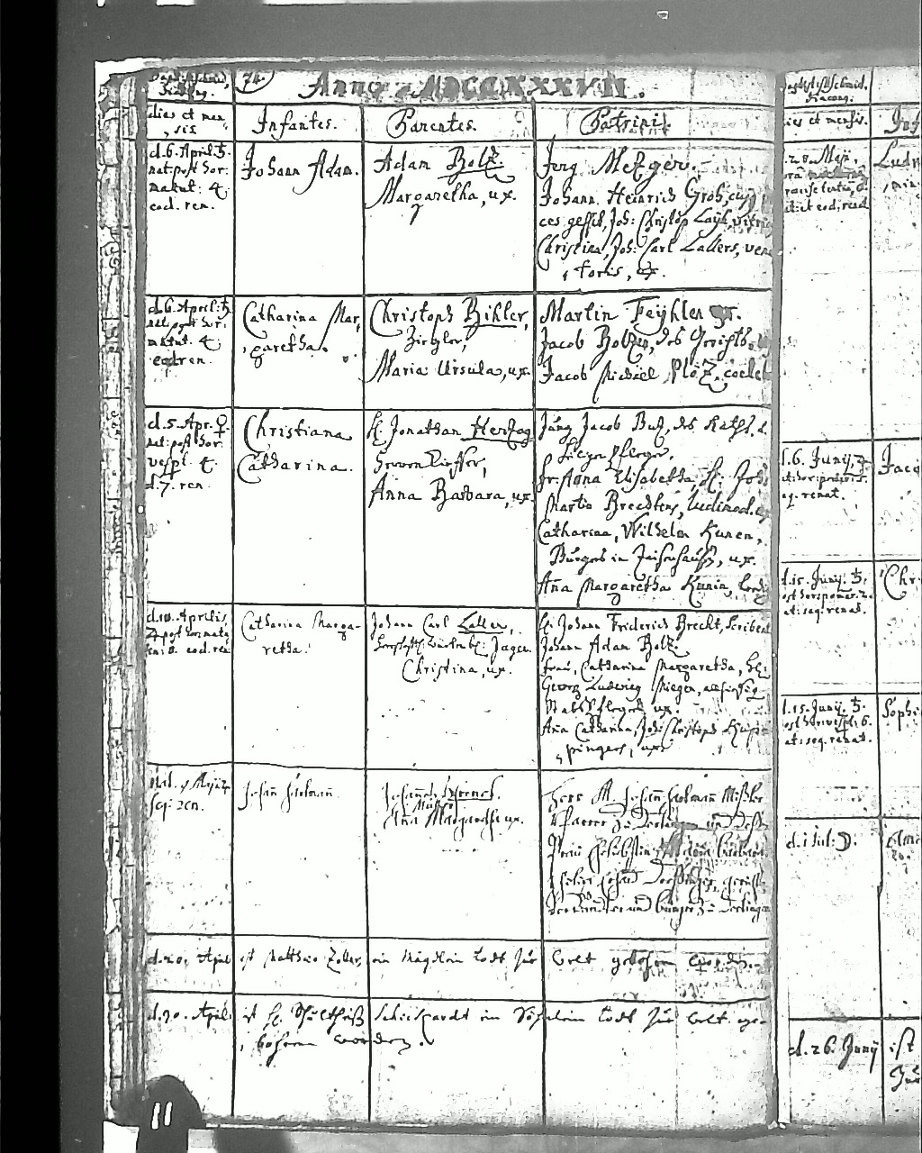 16 February; Christening: Maria Magualena; Parents: Sebastain Gindar Boltz; Anna Maria; sponsors: 3