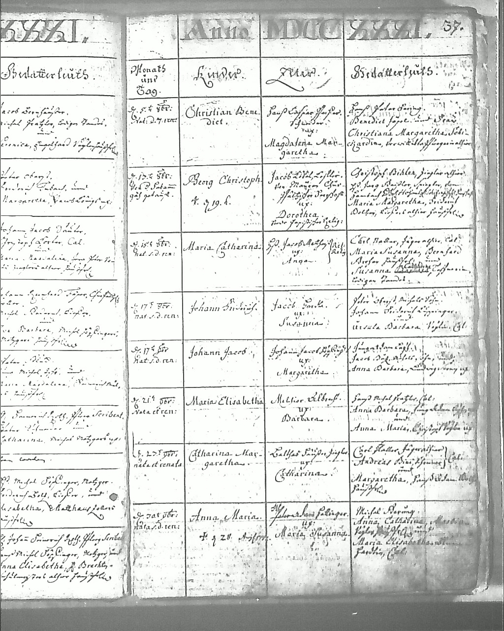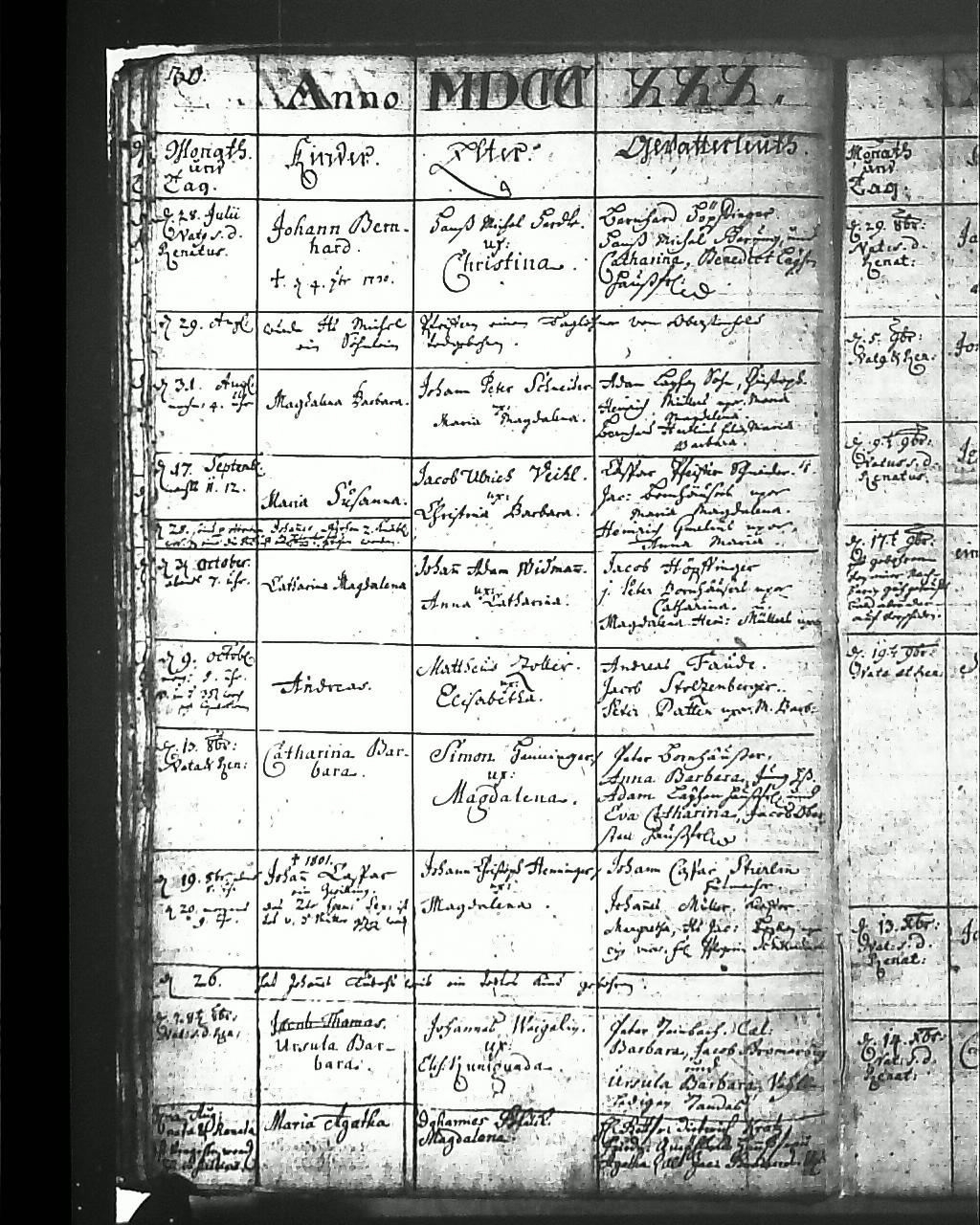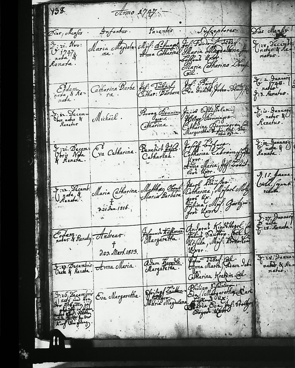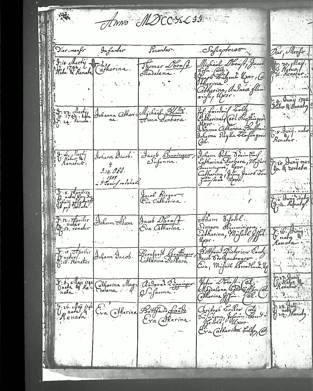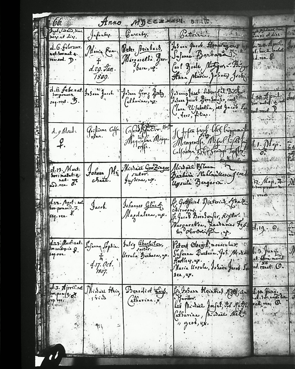 16 February; Christening: Maria Magualena; Parents: Sebastain Gindar Boltz; Anna Maria; sponsors: 3