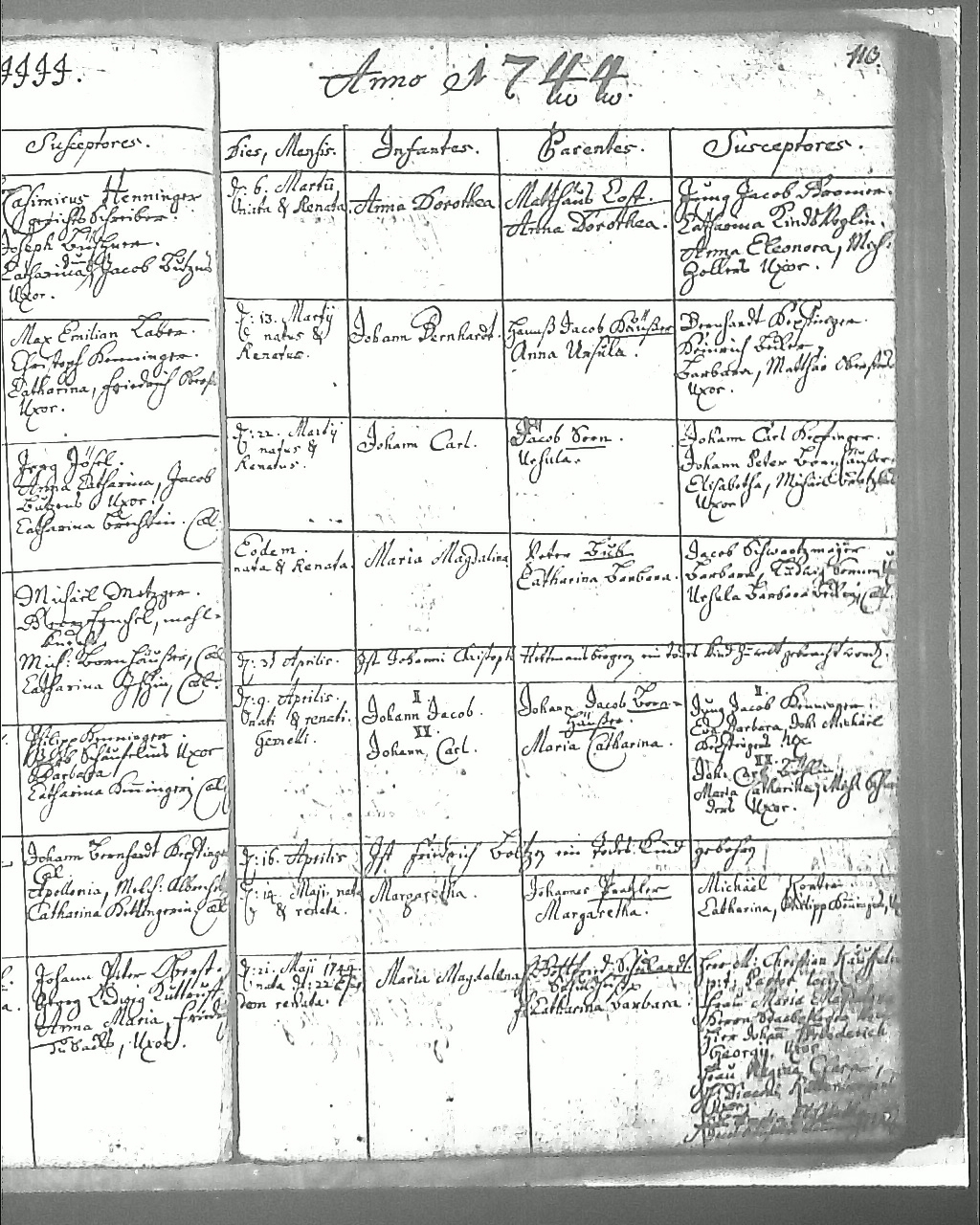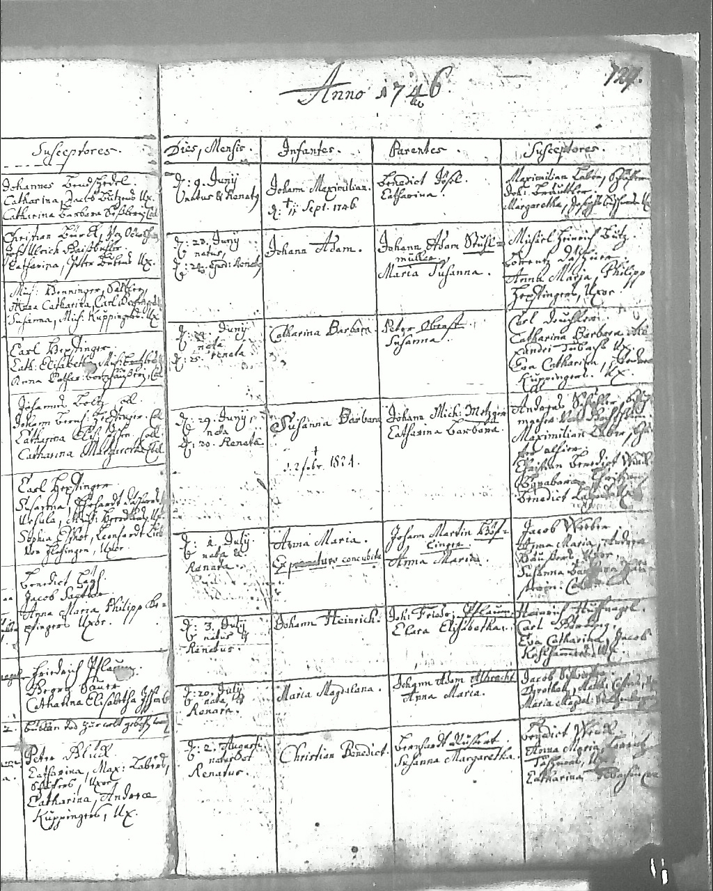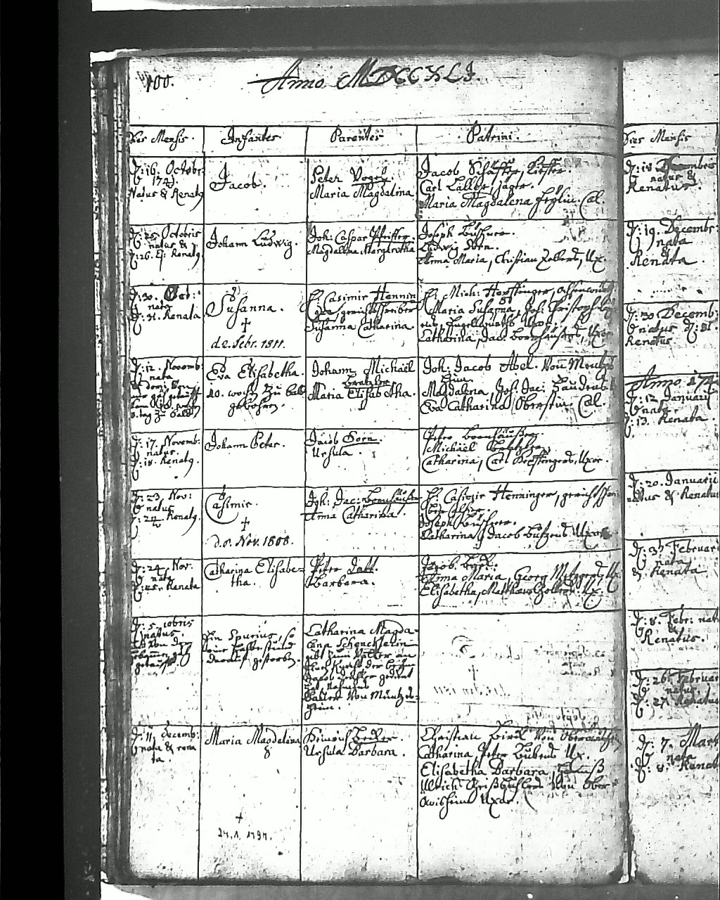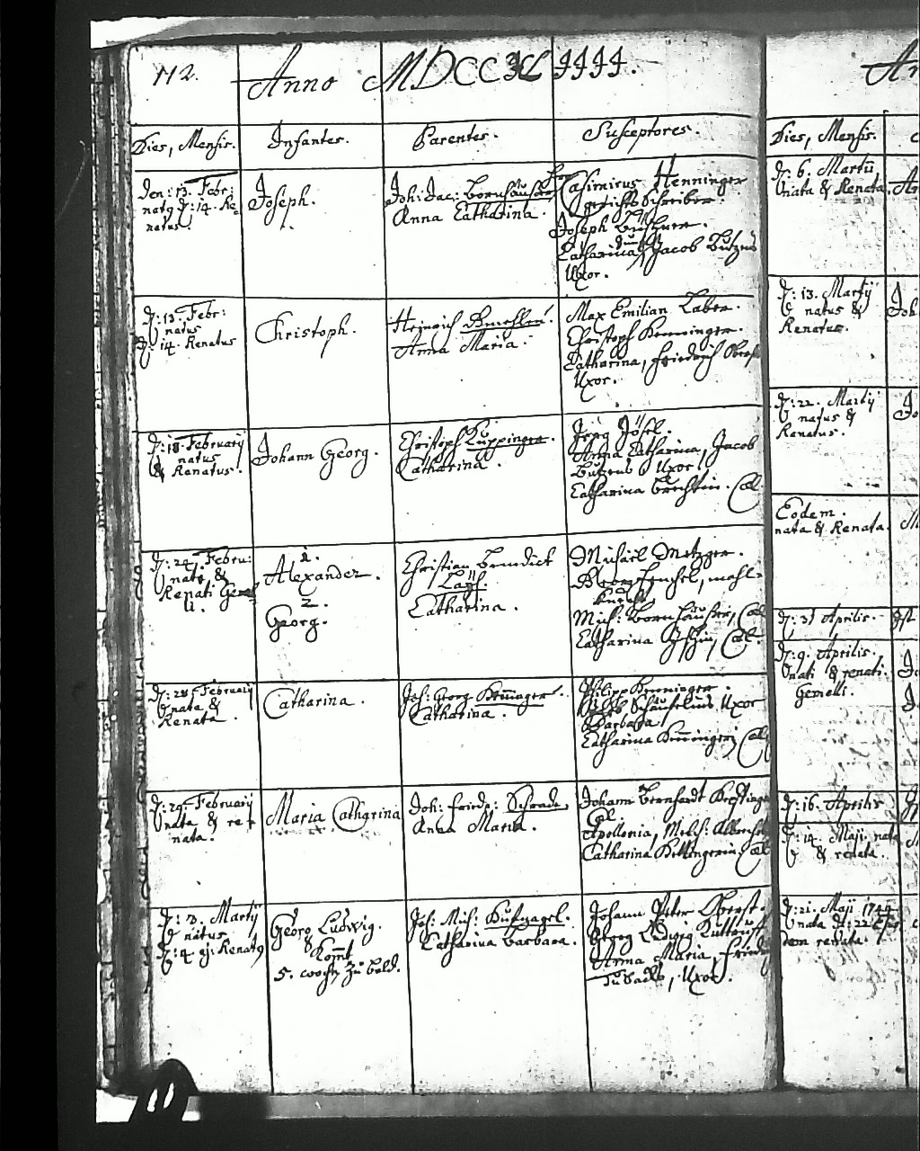 16 February; Christening: Maria Magualena; Parents: Sebastain Gindar Boltz; Anna Maria; sponsors: 3